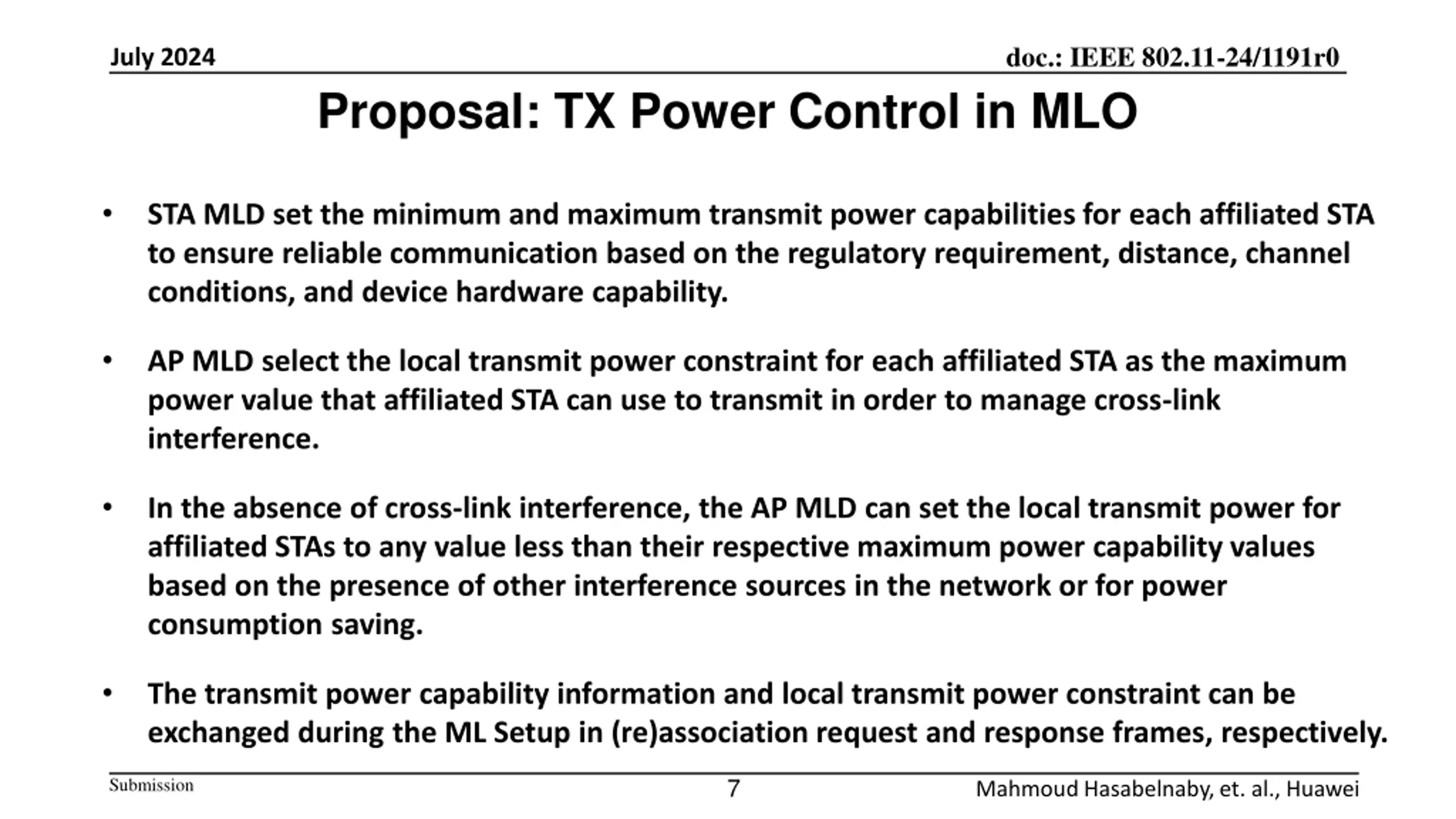 doc.: IEEE 802.11-24/1191r0 July 2024 Proposal: TX Power Control in MLO One way to manage the cross-link interference in STR multi-link operations, while retaining many benefits of the STR mode, is to adapt the transmission power values on the impacted links. 1. A STA MLD informs an AP MLD of the minimum and maximum transmit power capability for the current channel over each affiliated STA AP MLD STA MLD 2. Process input data 3. AP MLD informs each affiliated STA with STA MLD with its local transmit power constraint AP MLD checks if the frequency gap between affiliated STA ? and affiliated STA ? > certain non-zero threshold value Yes No No cross-link interference. AP MLD sets the local transmit power for affiliated STA ? and affiliated STA ? to their respective maximum transmit power capability values Cross-link interference exists. AP MLD sets the local transmit power for affiliated STA ? and affiliated STA ? to their respective minimum transmit power capability values 6 Submission Mahmoud Hasabelnaby, et. al., Huawei