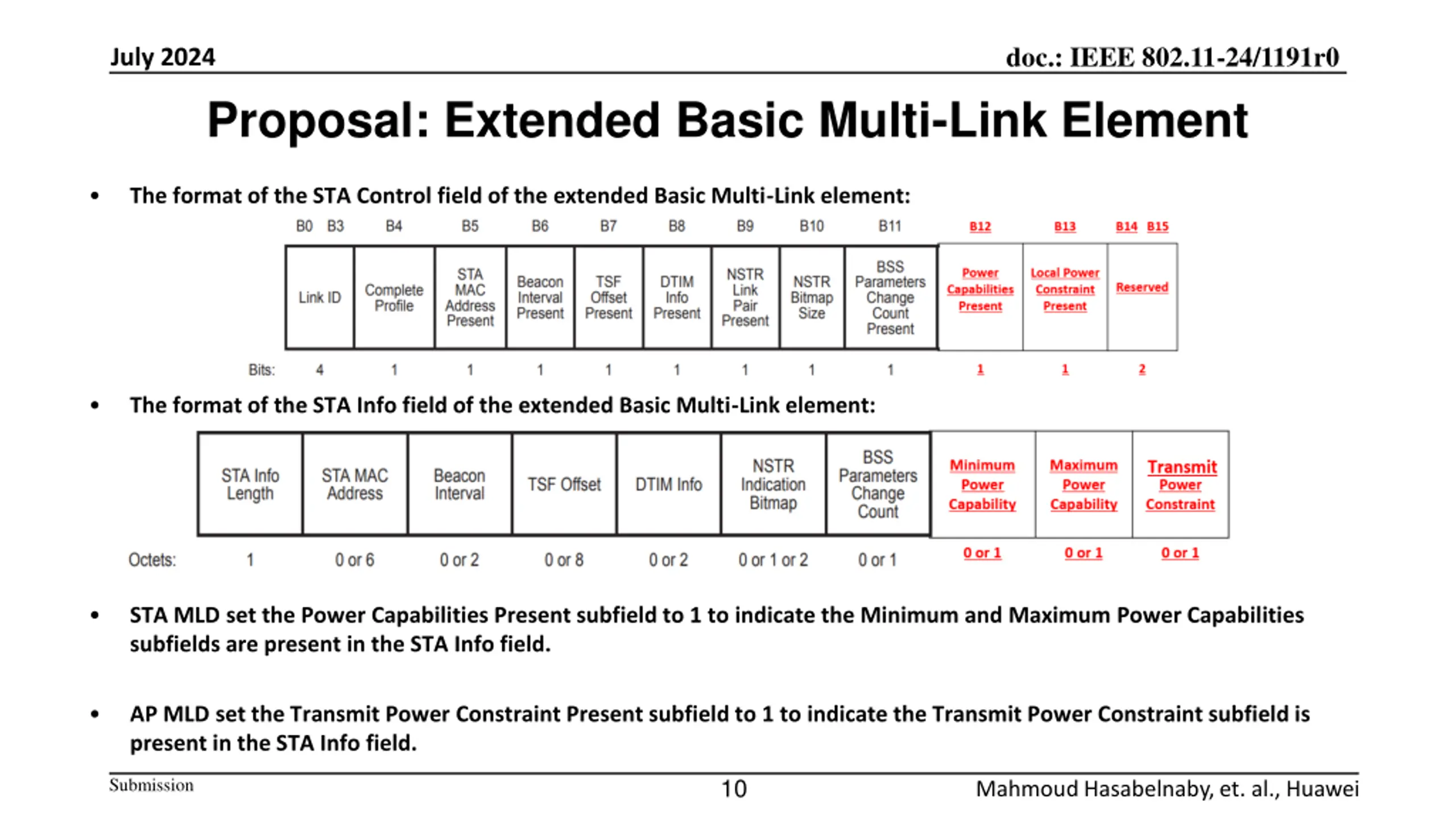 doc.: IEEE 802.11-24/1191r0 July 2024 Proposal: Extended Basic Multi-Link Element The format of the STA Control field of the extended Basic Multi-Link element: The format of the STA Info field of the extended Basic Multi-Link element: STA MLD set the Power Capabilities Present subfield to 1 to indicate the Minimum and Maximum Power Capabilities subfields are present in the STA Info field. AP MLD set the Transmit Power Constraint Present subfield to 1 to indicate the Transmit Power Constraint subfield is present in the STA Info field. 10 Submission Mahmoud Hasabelnaby, et. al., Huawei