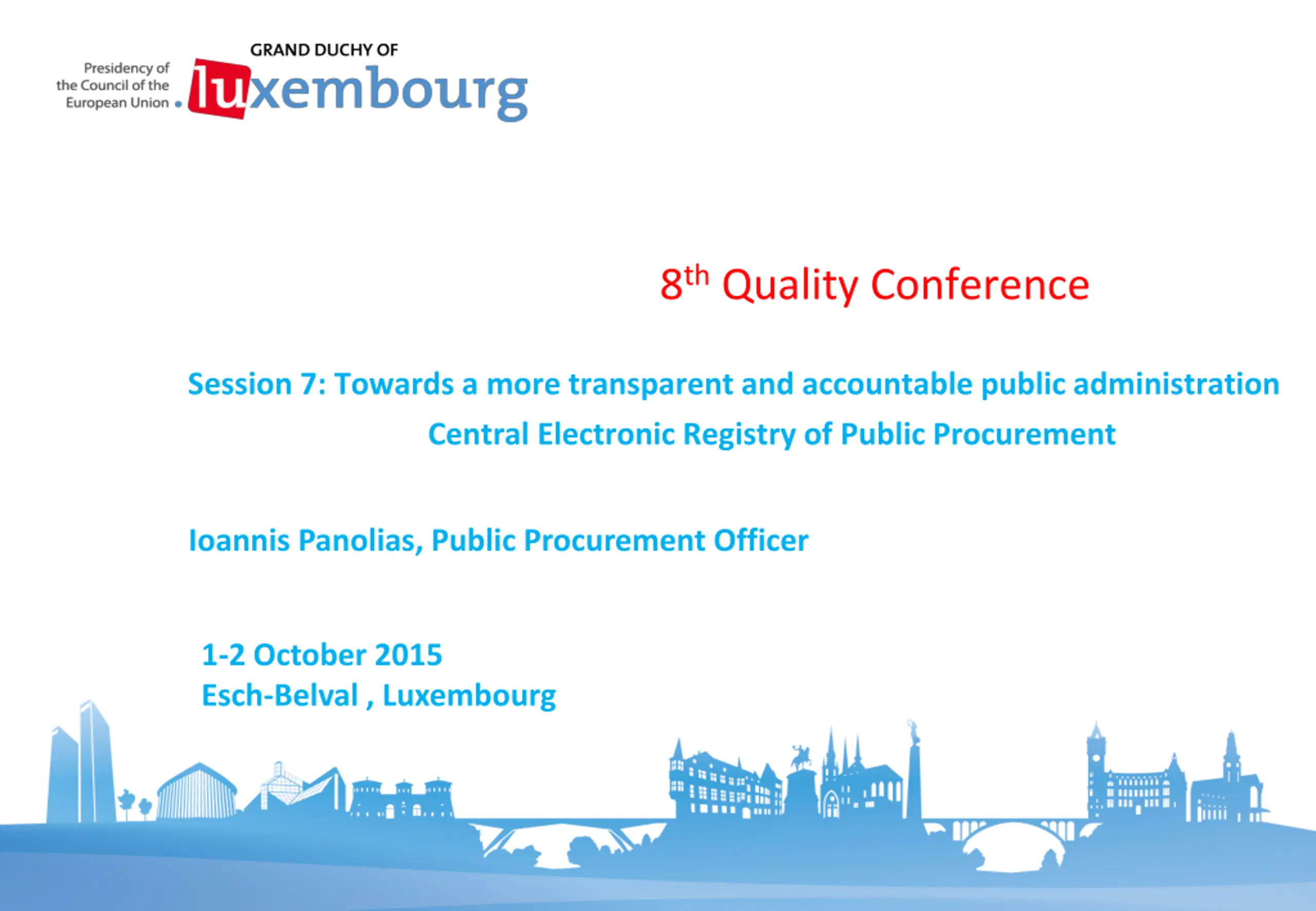 8thQuality Conference Session 7: Towards a more transparent and accountable public administration Central Electronic Registry of Public Procurement Ioannis Panolias, Public Procurement Officer 1-2 October 2015 Esch-Belval , Luxembourg
