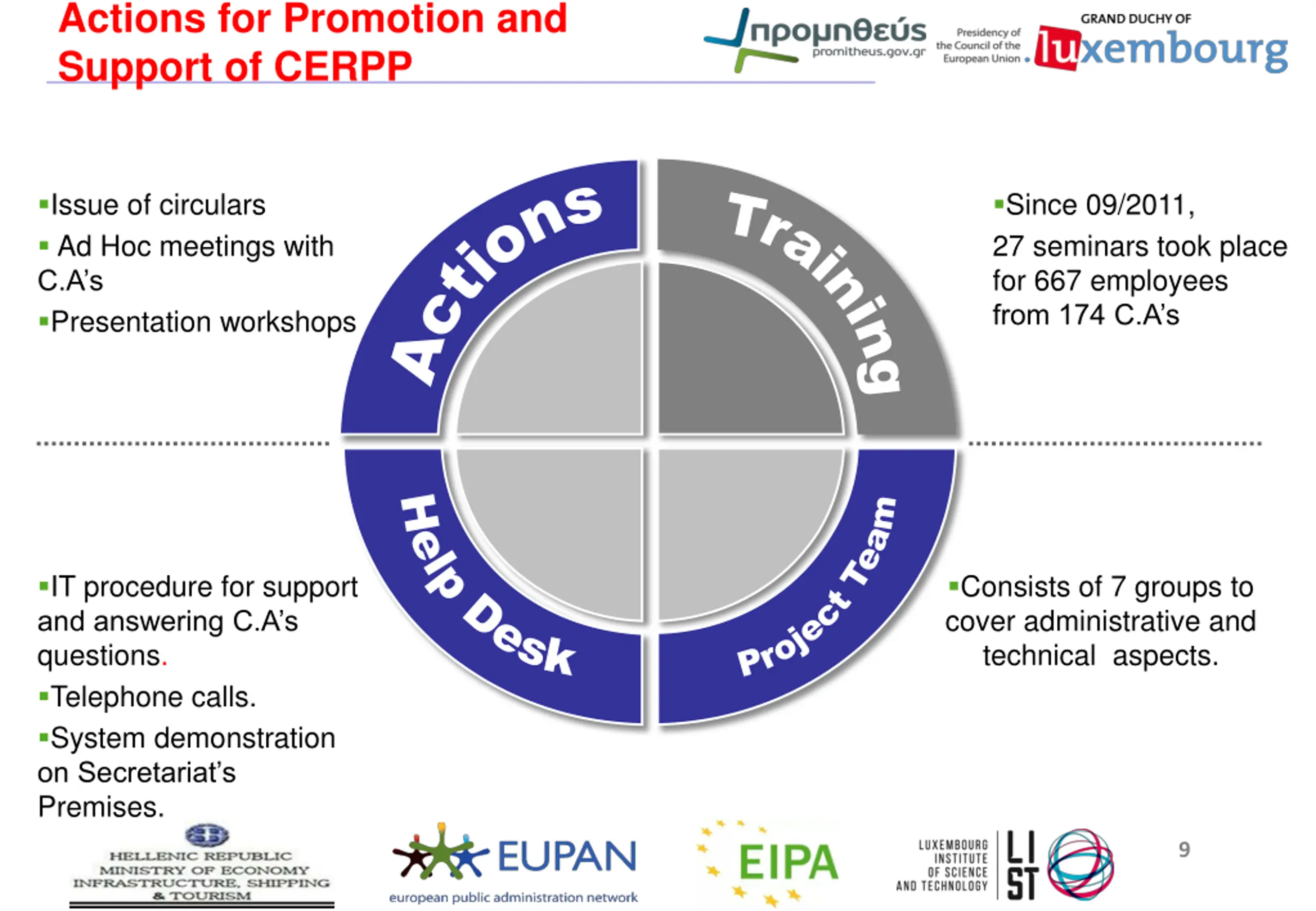 Actions for Promotion and Support of CERPP A Ac ct ti io on ns s Training Issue of circulars Ad Hoc meetings with C.A s Presentation workshops Since 09/2011, 27 seminars took place for 667 employees from 174 C.A s Help Desk Project Team IT procedure for support and answering C.A s questions. Telephone calls. System demonstration on Secretariat s Premises. Consists of 7 groups to cover administrative and technical aspects. 9