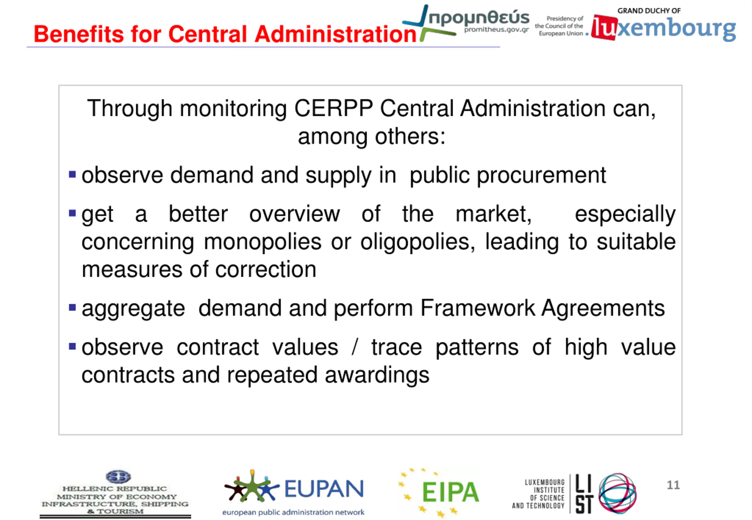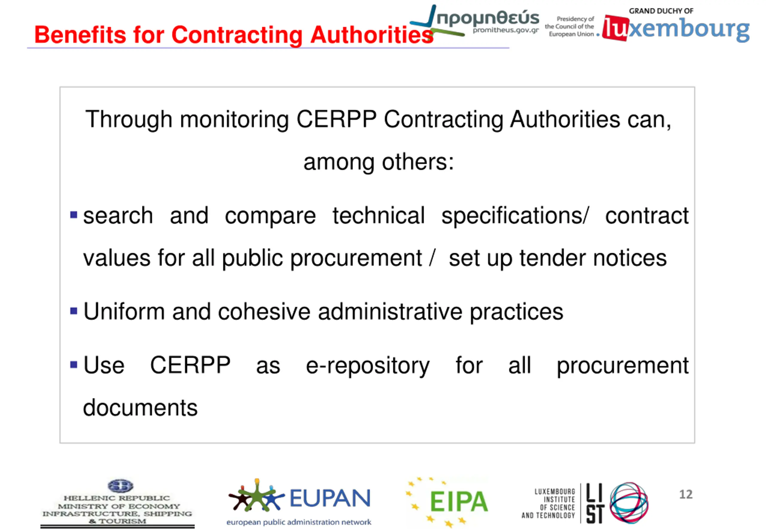 Benefits for Central Administration Through monitoring CERPP Central Administration can, among others: observe demand and supply in public procurement get a better overview of the market, especially concerning monopolies or oligopolies, leading to suitable measures of correction aggregate demand and perform Framework Agreements observe contract values / trace patterns of high value contracts and repeated awardings 11