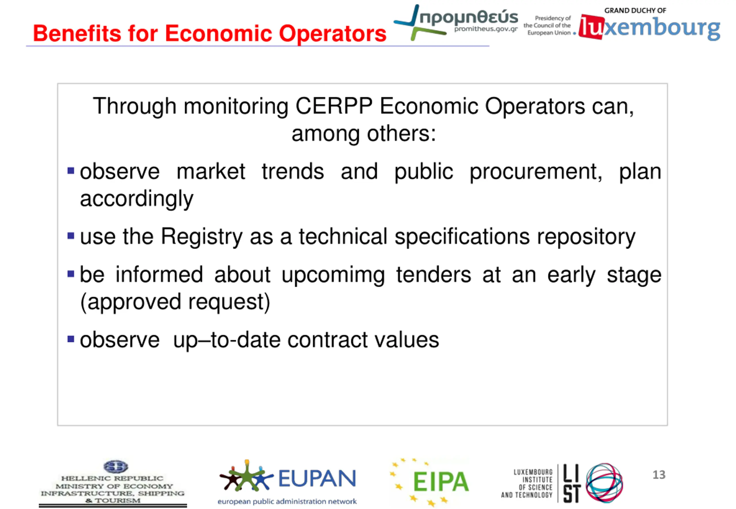 Benefits for Contracting Authorities Through monitoring CERPP Contracting Authorities can, among others: search and compare technical specifications/ contract values for all public procurement / set up tender notices Uniform and cohesive administrative practices Use CERPP as e-repository for all procurement documents 12