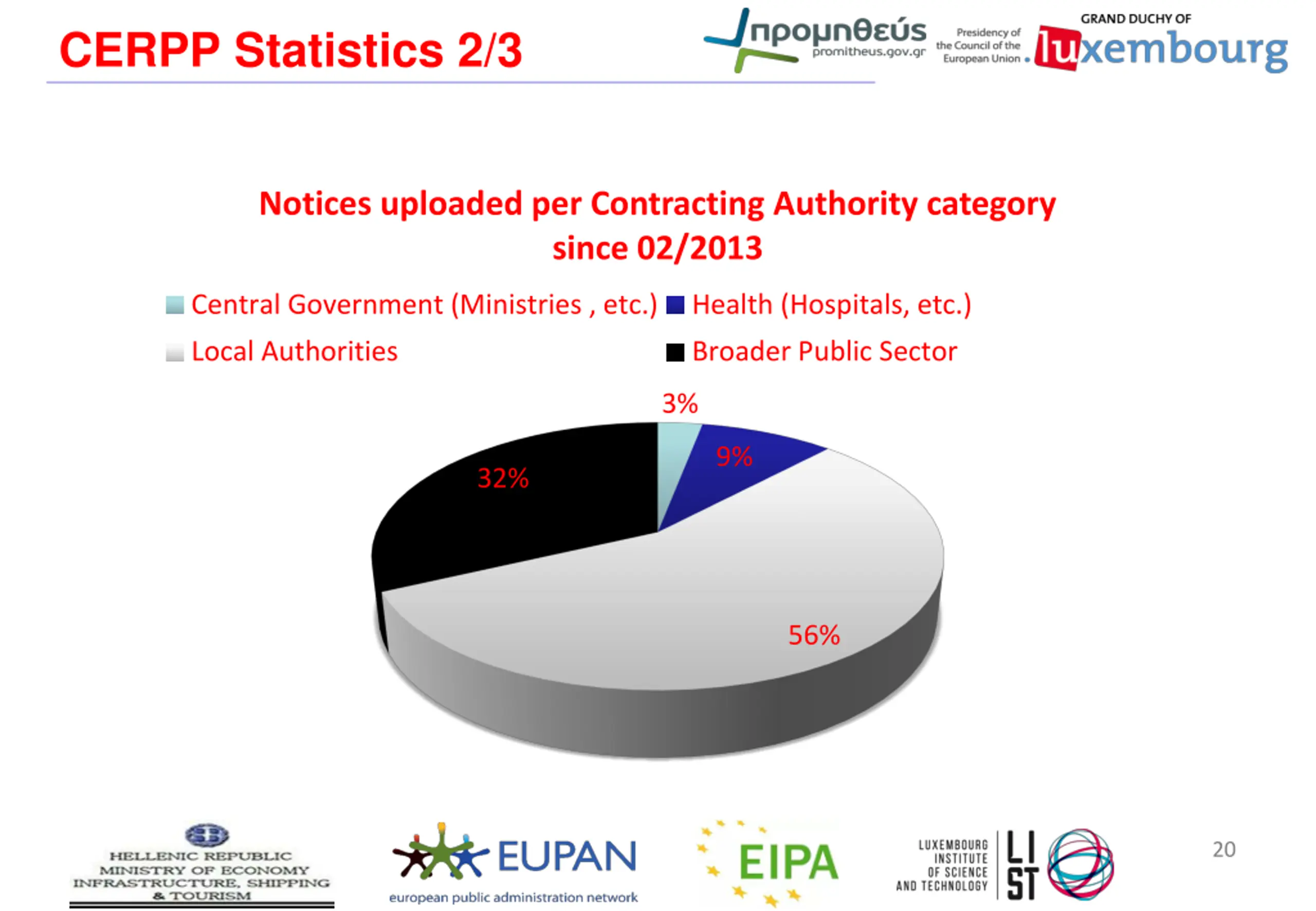 CERPP Statistics 2/3 Notices uploaded per Contracting Authority category since 02/2013 Central Government (Ministries , etc.) Health (Hospitals, etc.) Local Authorities Broader Public Sector 3% 9% 32% 56% 20