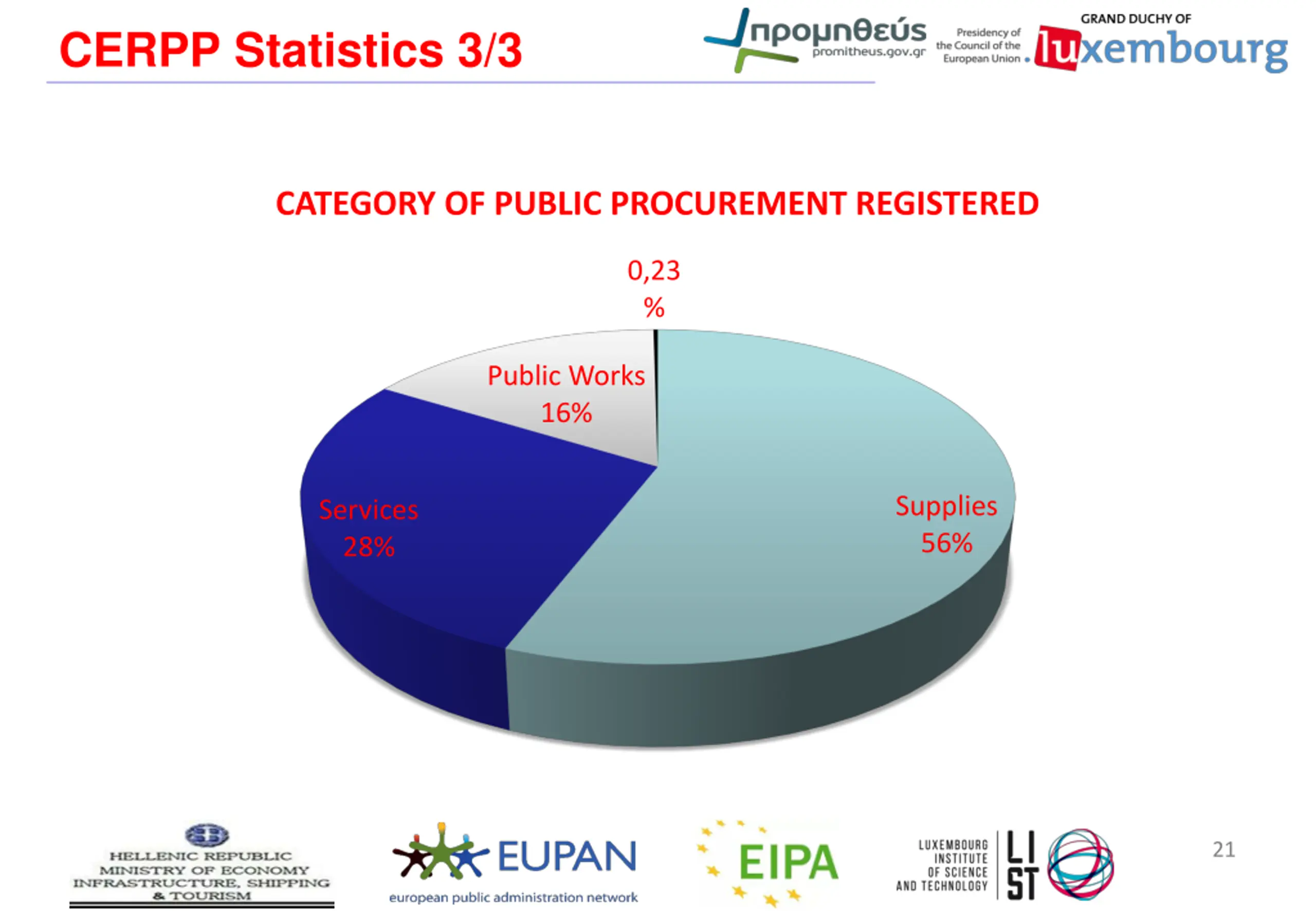 CERPP Statistics 3/3 CATEGORY OF PUBLIC PROCUREMENT REGISTERED 0,23 % Public Works 16% Supplies 56% Services 28% 21