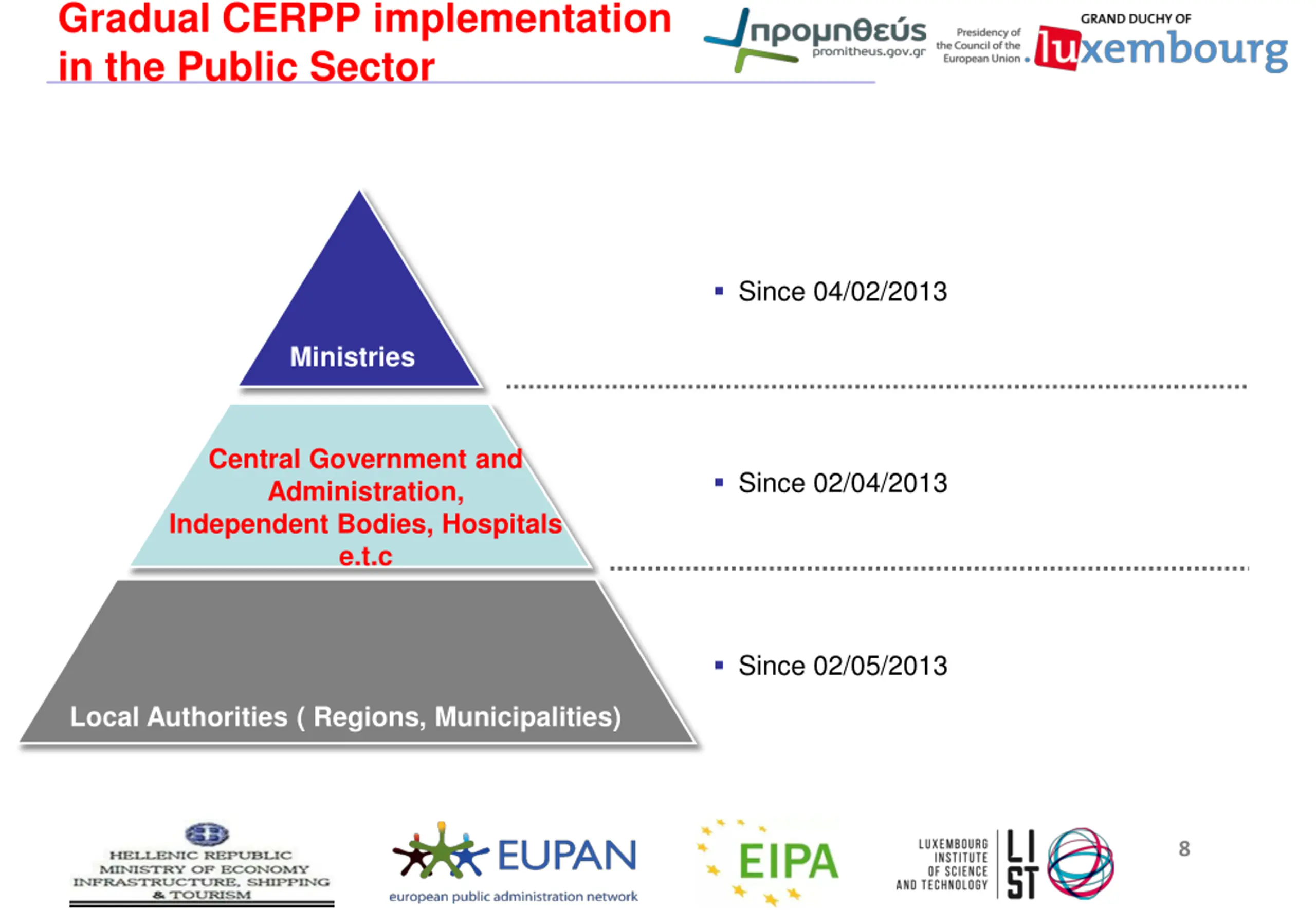 Gradual CERPP implementation in the Public Sector Since 04/02/2013 Ministries Central Government and Administration, Independent Bodies, Hospitals e.t.c Since 02/04/2013 Since 02/05/2013 Local Authorities ( Regions, Municipalities) 8