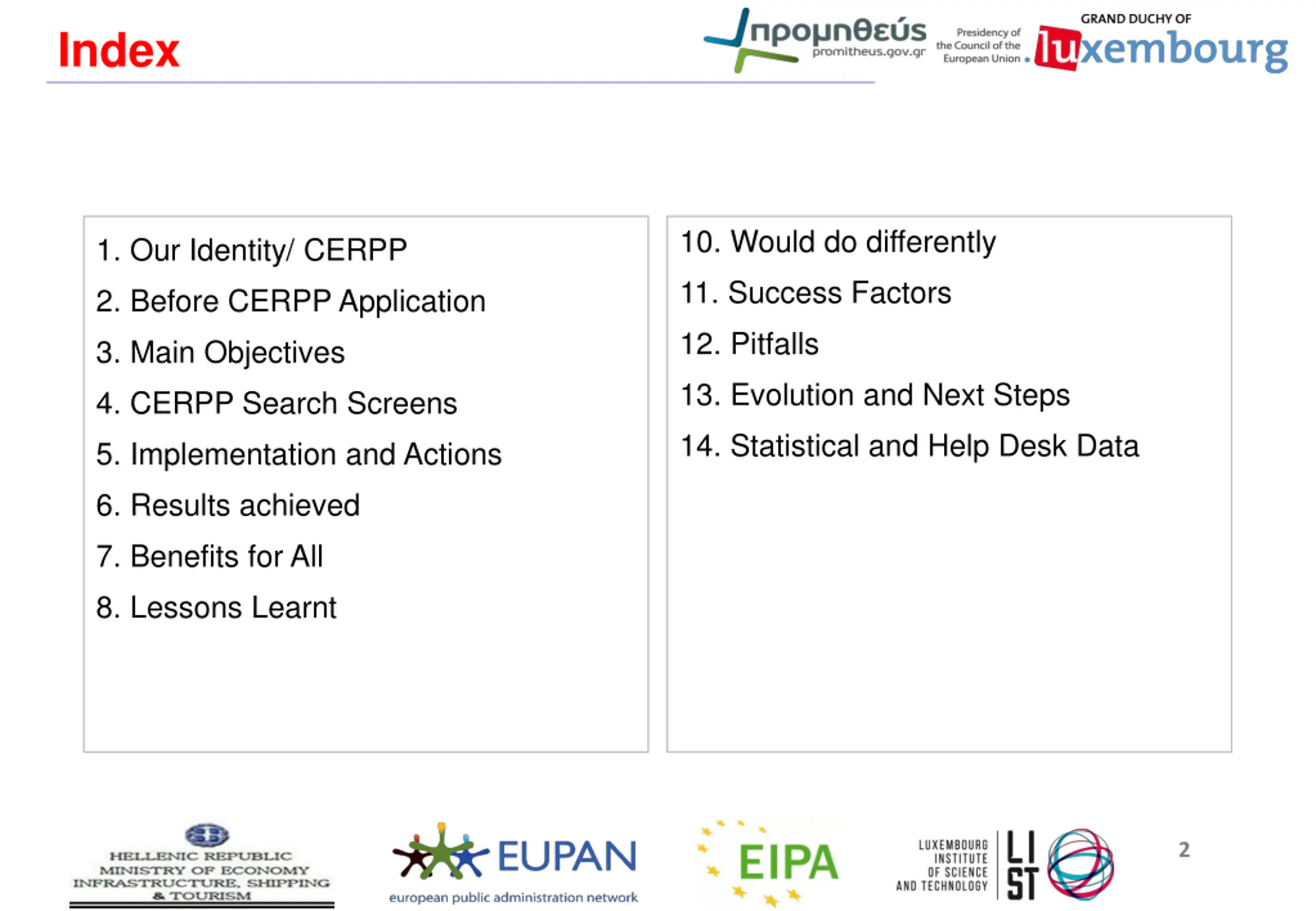 Index Insert your own text here Insert our own text here 10. Would do differently 1. Our Identity/ CERPP 11. Success Factors 2. Before CERPP Application 12. Pitfalls 3. Main Objectives 13. Evolution and Next Steps 4. CERPP Search Screens 14. Statistical and Help Desk Data 5. Implementation and Actions 6. Results achieved 7. Benefits for All 8. Lessons Learnt 2
