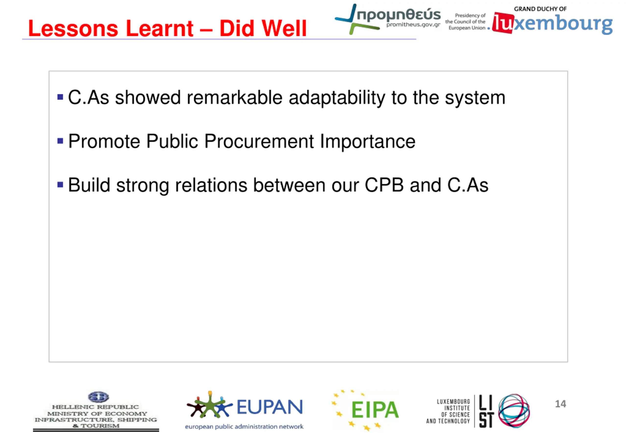 Lessons Learnt Did Well C.As showed remarkable adaptability to the system Promote Public Procurement Importance Build strong relations between our CPB and C.As 14