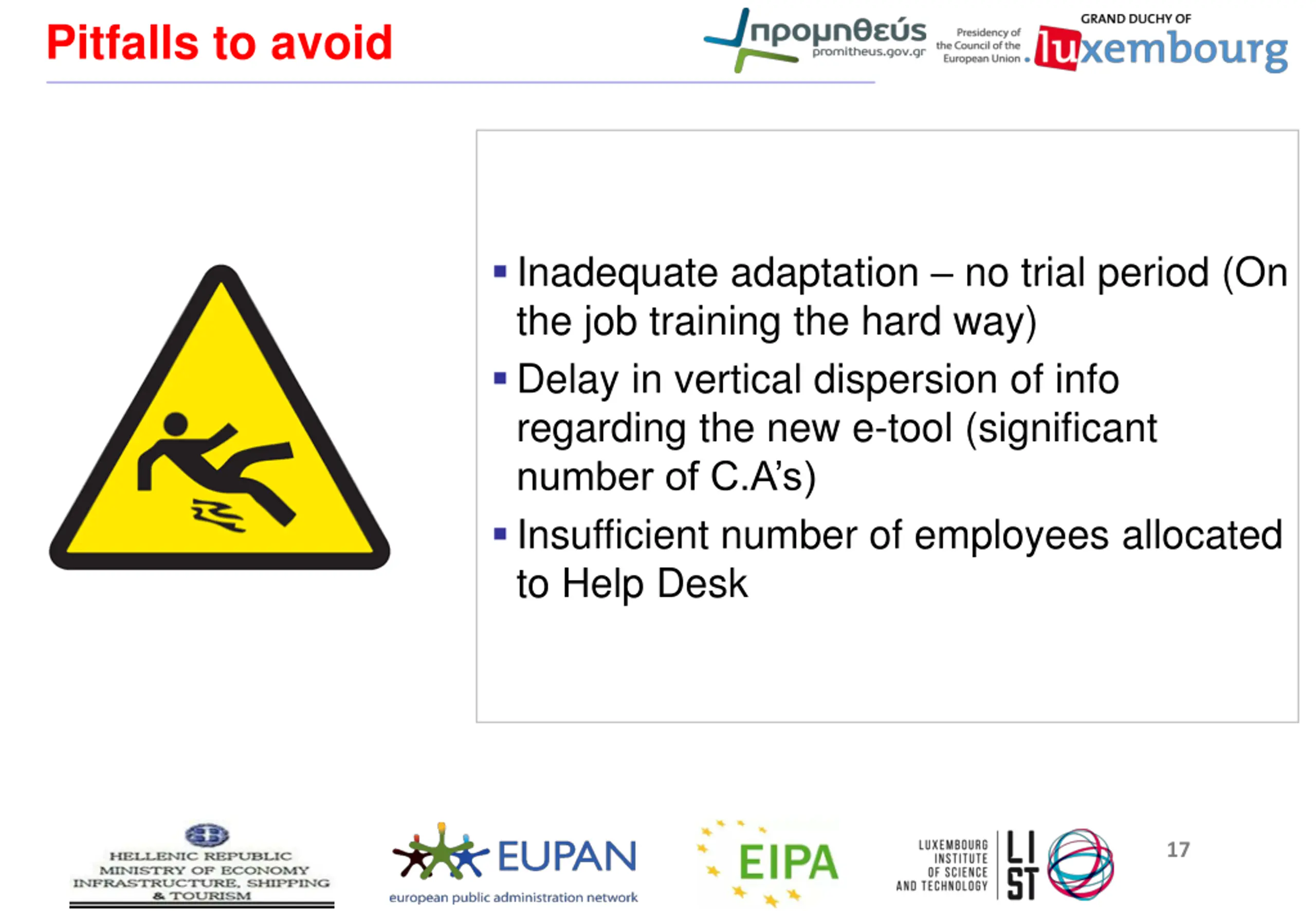 Pitfalls to avoid Inadequate adaptation no trial period (On the job training the hard way) Delay in vertical dispersion of info regarding the new e-tool (significant number of C.A s) Insufficient number of employees allocated to Help Desk 17
