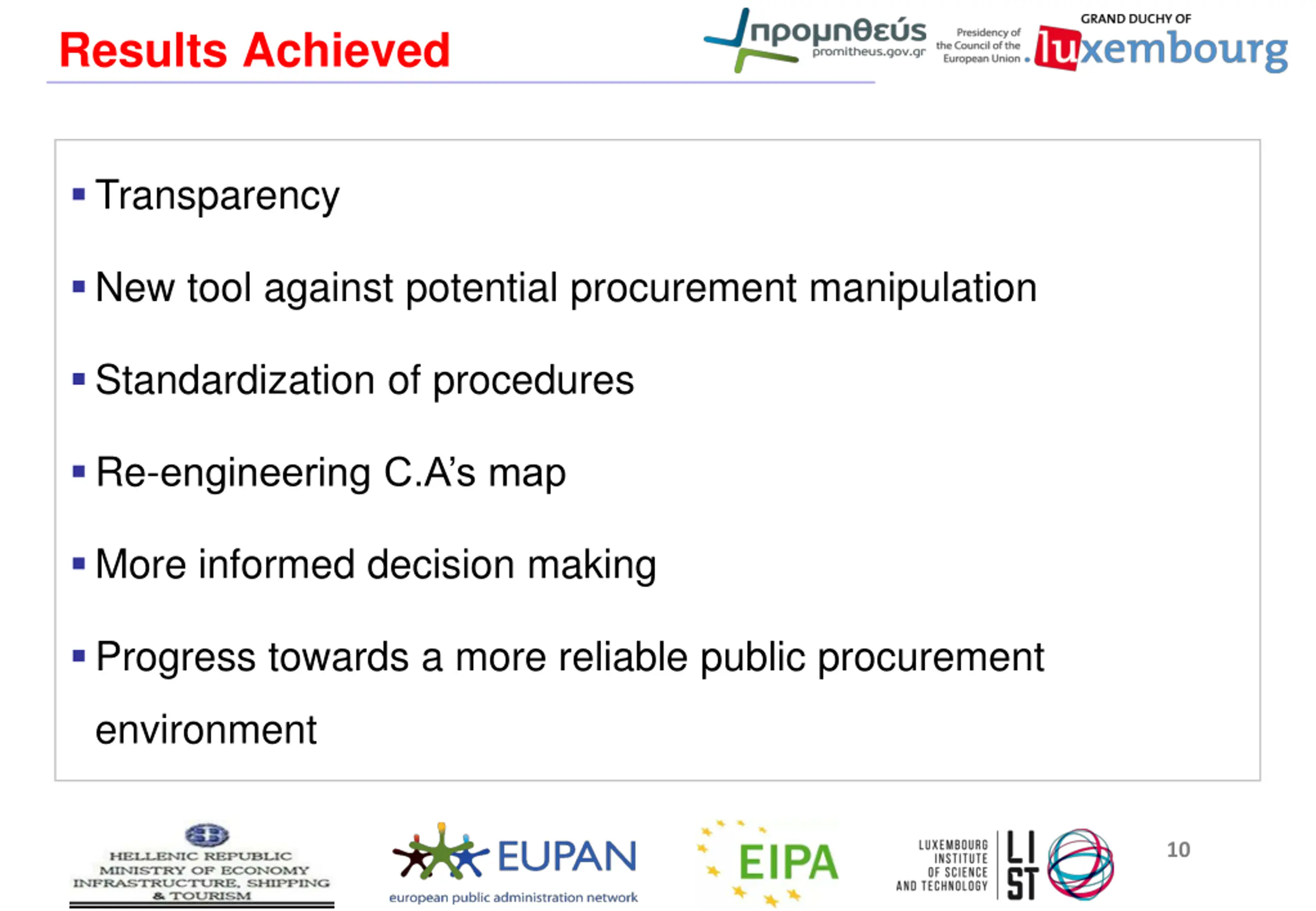 Results Achieved Transparency New tool against potential procurement manipulation Standardization of procedures Re-engineering C.A s map More informed decision making Progress towards a more reliable public procurement environment 10