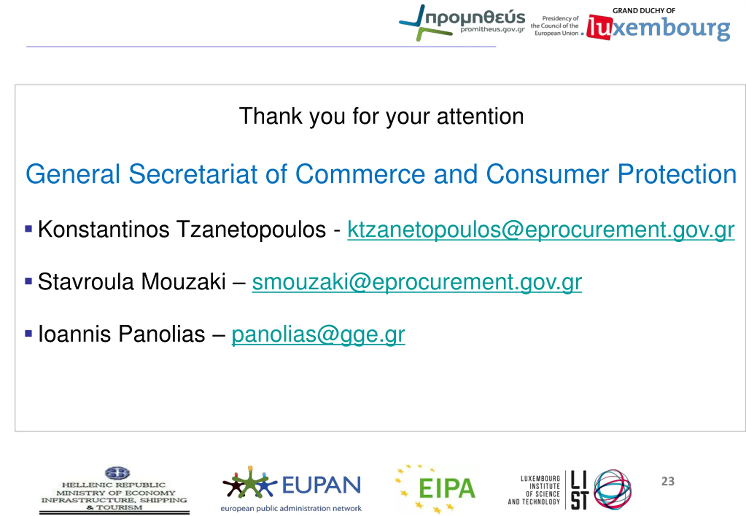 Thank you for your attention General Secretariat of Commerce and Consumer Protection Konstantinos Tzanetopoulos - ktzanetopoulos@eprocurement.gov.gr Stavroula Mouzaki smouzaki@eprocurement.gov.gr Ioannis Panolias panolias@gge.gr 23