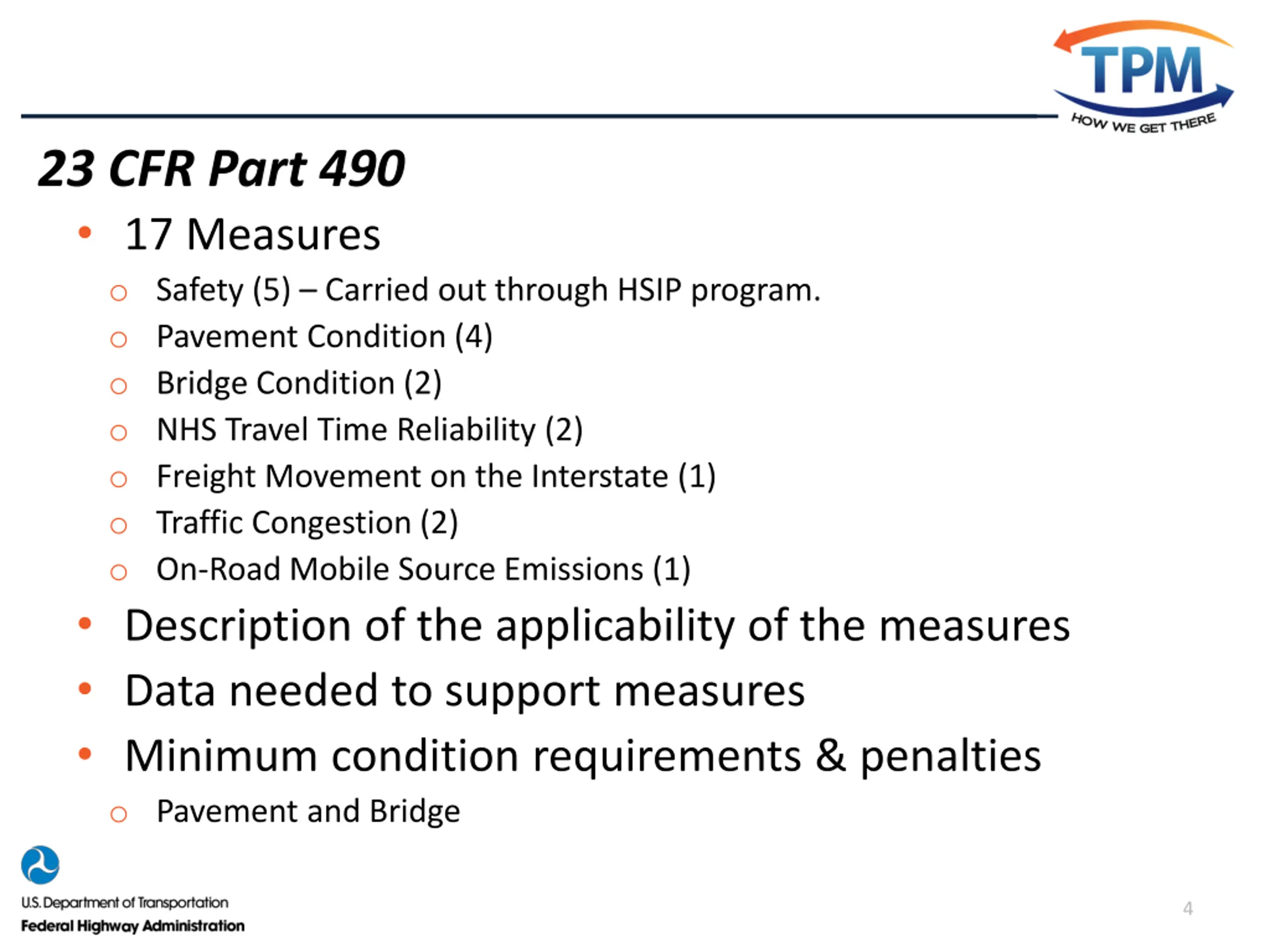 FHWA Rulemakings TPM-Related Rules Rule Effective Date Regulatory Chapter Safety Performance Measures (PM1) 23 CFR 490 (Subpart A & B) April 14, 2016 Highway Safety Improvement Program (HSIP) April 14, 2016 23 CFR 924 Statewide and Non-Metropolitan Planning; Metropolitan Planning June 27, 2016 23 CFR 450 Highway Asset Management Plans for NHS October 2, 2017 23 CFR 515 & 667 Pavement and Bridge Condition Measures (PM2) 23 CFR 490 (Subpart A, C & D) May 20, 2017 Performance of the NHS, Freight, and CMAQ Measures (PM3) 23 CFR 490 (Sub. A, E, F, G, H) May 20, 2017 3