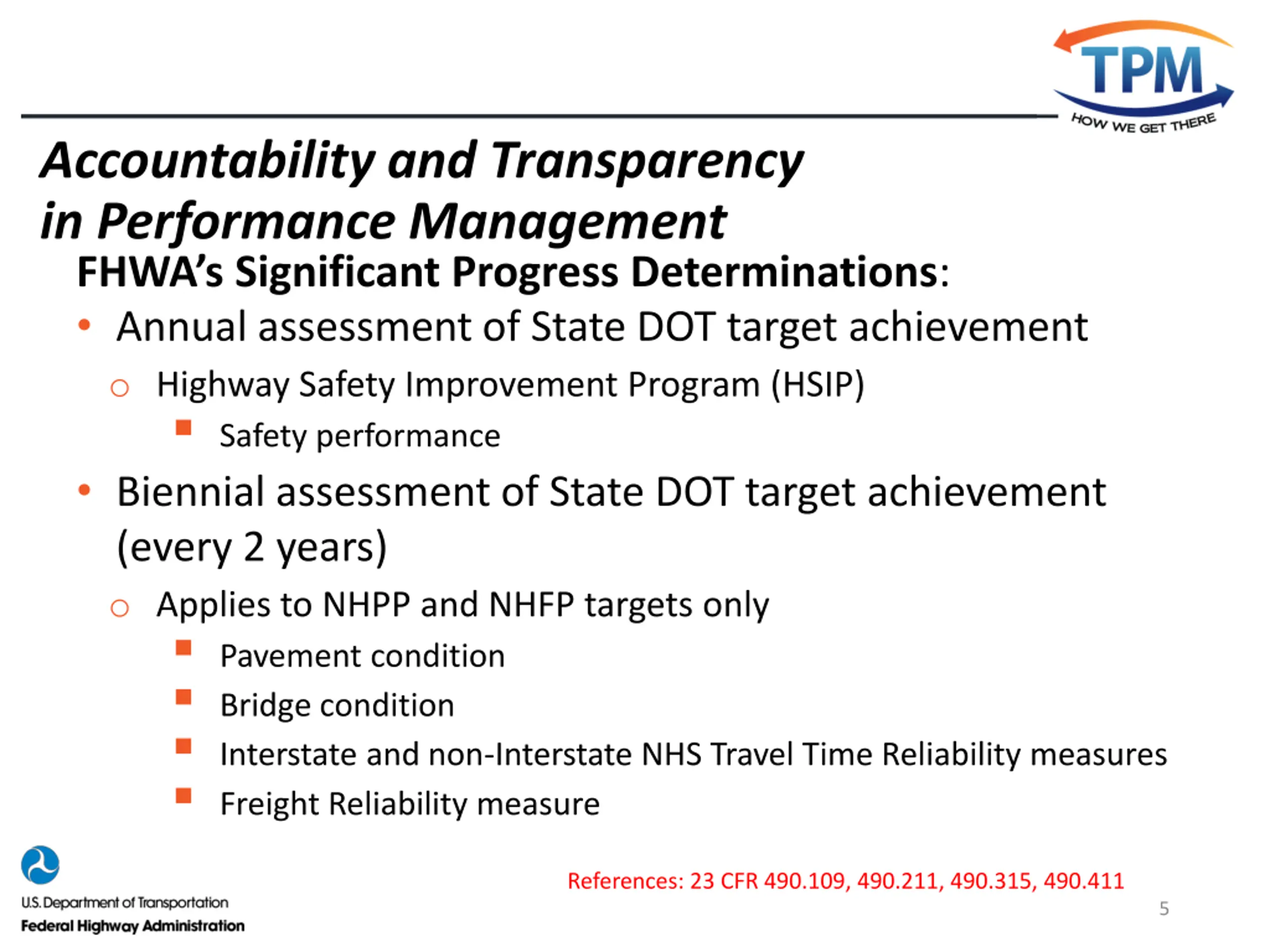 Accountability and Transparency in Performance Management FHWA s Significant Progress Determinations: Annual assessment of State DOT target achievement o Highway Safety Improvement Program (HSIP) Safety performance Biennial assessment of State DOT target achievement (every 2 years) o Applies to NHPP and NHFP targets only Pavement condition Bridge condition Interstate and non-Interstate NHS Travel Time Reliability measures Freight Reliability measure References: 23 CFR 490.109, 490.211, 490.315, 490.411 5