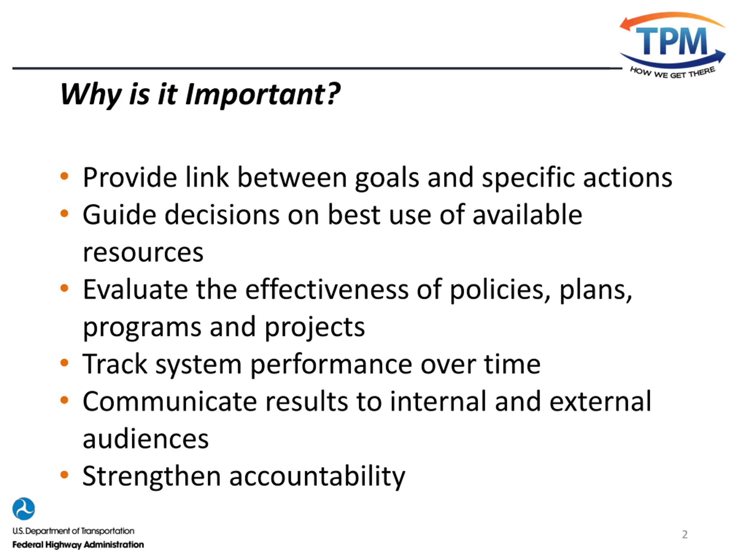 Why is it Important? Provide link between goals and specific actions Guide decisions on best use of available resources Evaluate the effectiveness of policies, plans, programs and projects Track system performance over time Communicate results to internal and external audiences Strengthen accountability 2