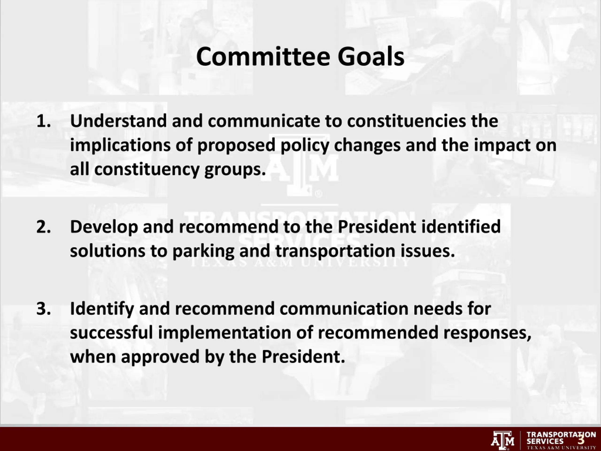 Committee Goals 1. Understand and communicate to constituencies the implications of proposed policy changes and the impact on all constituency groups. 2. Develop and recommend to the President identified solutions to parking and transportation issues. 3. Identify and recommend communication needs for successful implementation of recommended responses, when approved by the President. 3