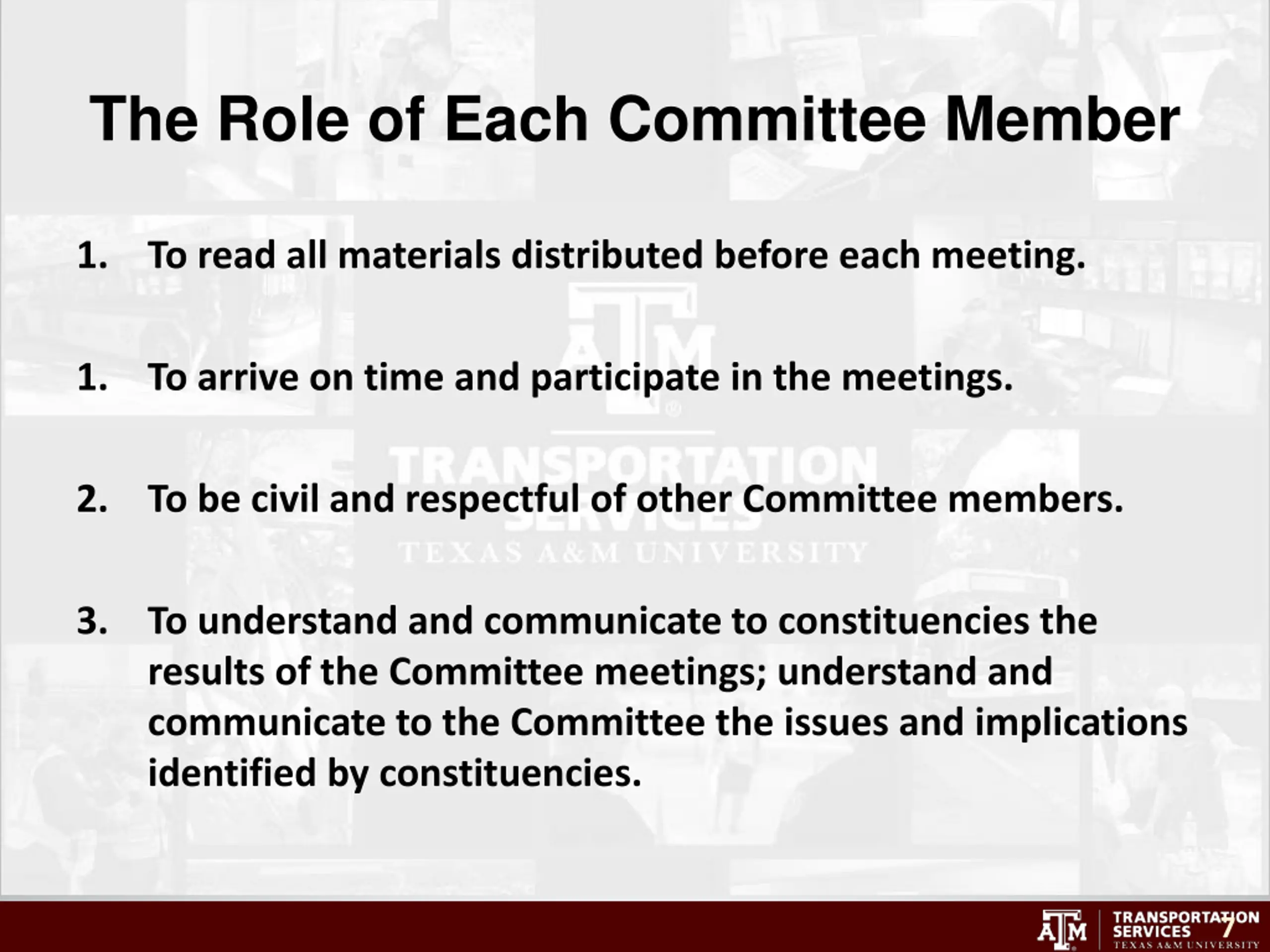 The Role of Each Committee Member 1. To read all materials distributed before each meeting. 1. To arrive on time and participate in the meetings. 2. To be civil and respectful of other Committee members. 3. To understand and communicate to constituencies the results of the Committee meetings; understand and communicate to the Committee the issues and implications identified by constituencies. 7