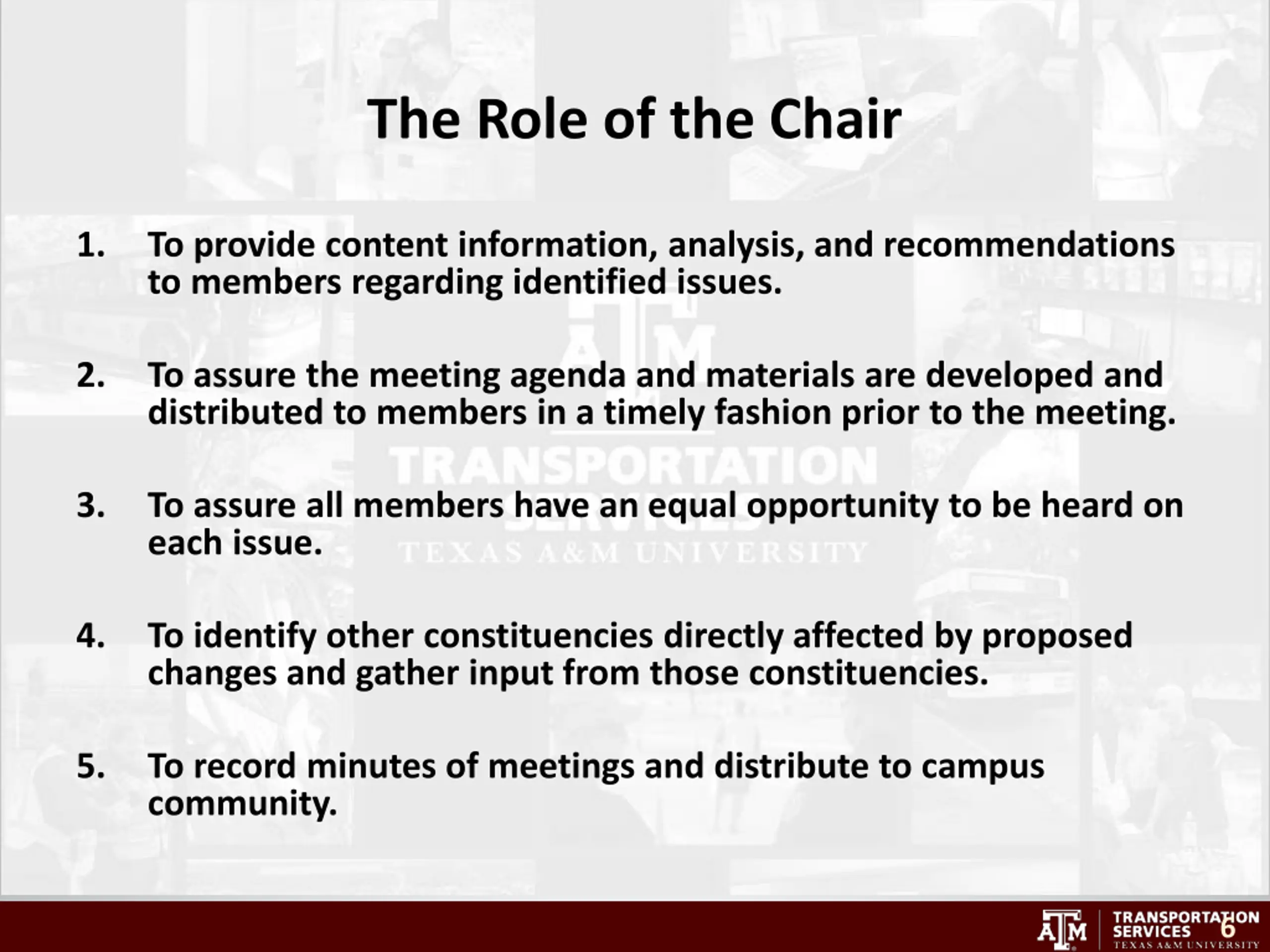 The Role of the Chair 1. To provide content information, analysis, and recommendations to members regarding identified issues. 2. To assure the meeting agenda and materials are developed and distributed to members in a timely fashion prior to the meeting. 3. To assure all members have an equal opportunity to be heard on each issue. 4. To identify other constituencies directly affected by proposed changes and gather input from those constituencies. 5. To record minutes of meetings and distribute to campus community. 6