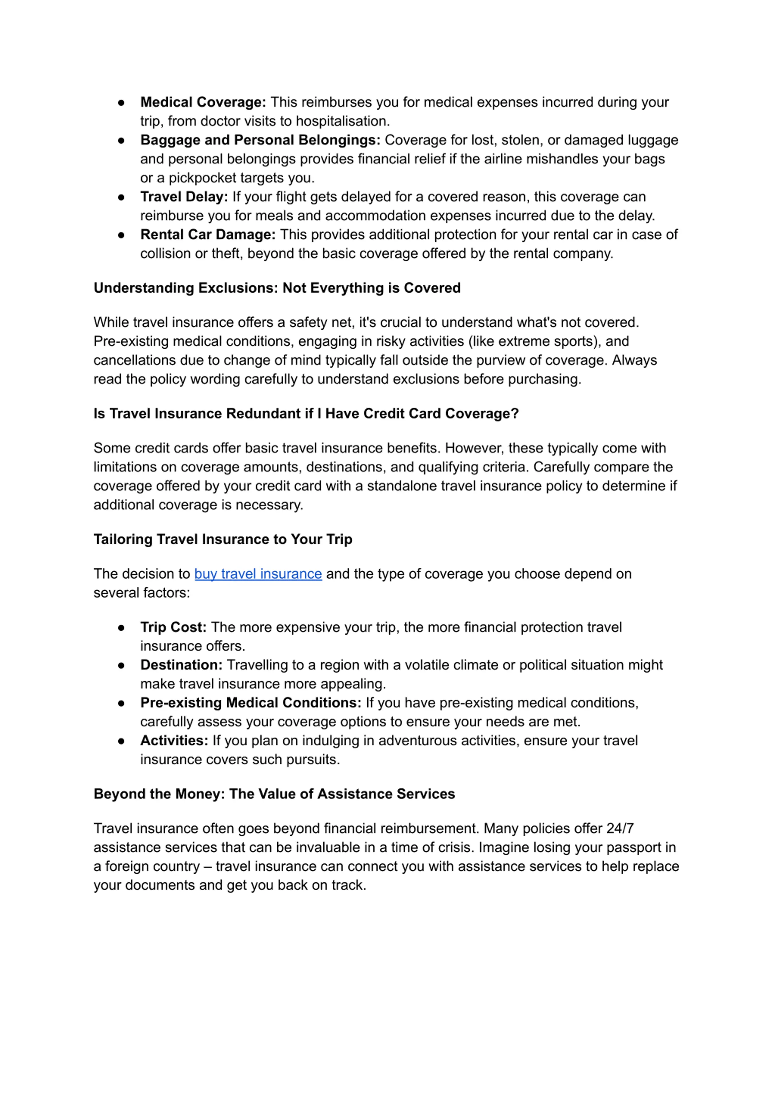 Medical Coverage: This reimburses you for medical expenses incurred during your trip, from doctor visits to hospitalisation. Baggage and Personal Belongings: Coverage for lost, stolen, or damaged luggage and personal belongings provides financial relief if the airline mishandles your bags or a pickpocket targets you. Travel Delay: If your flight gets delayed for a covered reason, this coverage can reimburse you for meals and accommodation expenses incurred due to the delay. Rental Car Damage: This provides additional protection for your rental car in case of collision or theft, beyond the basic coverage offered by the rental company. Understanding Exclusions: Not Everything is Covered While travel insurance offers a safety net, it's crucial to understand what's not covered. Pre-existing medical conditions, engaging in risky activities (like extreme sports), and cancellations due to change of mind typically fall outside the purview of coverage. Always read the policy wording carefully to understand exclusions before purchasing. Is Travel Insurance Redundant if I Have Credit Card Coverage? Some credit cards offer basic travel insurance benefits. However, these typically come with limitations on coverage amounts, destinations, and qualifying criteria. Carefully compare the coverage offered by your credit card with a standalone travel insurance policy to determine if additional coverage is necessary. Tailoring Travel Insurance to Your Trip The decision to buy travel insurance and the type of coverage you choose depend on several factors: Trip Cost: The more expensive your trip, the more financial protection travel insurance offers. Destination: Travelling to a region with a volatile climate or political situation might make travel insurance more appealing. Pre-existing Medical Conditions: If you have pre-existing medical conditions, carefully assess your coverage options to ensure your needs are met. Activities: If you plan on indulging in adventurous activities, ensure your travel insurance covers such pursuits. Beyond the Money: The Value of Assistance Services Travel insurance often goes beyond financial reimbursement. Many policies offer 24/7 assistance services that can be invaluable in a time of crisis. Imagine losing your passport in a foreign country travel insurance can connect you with assistance services to help replace your documents and get you back on track.