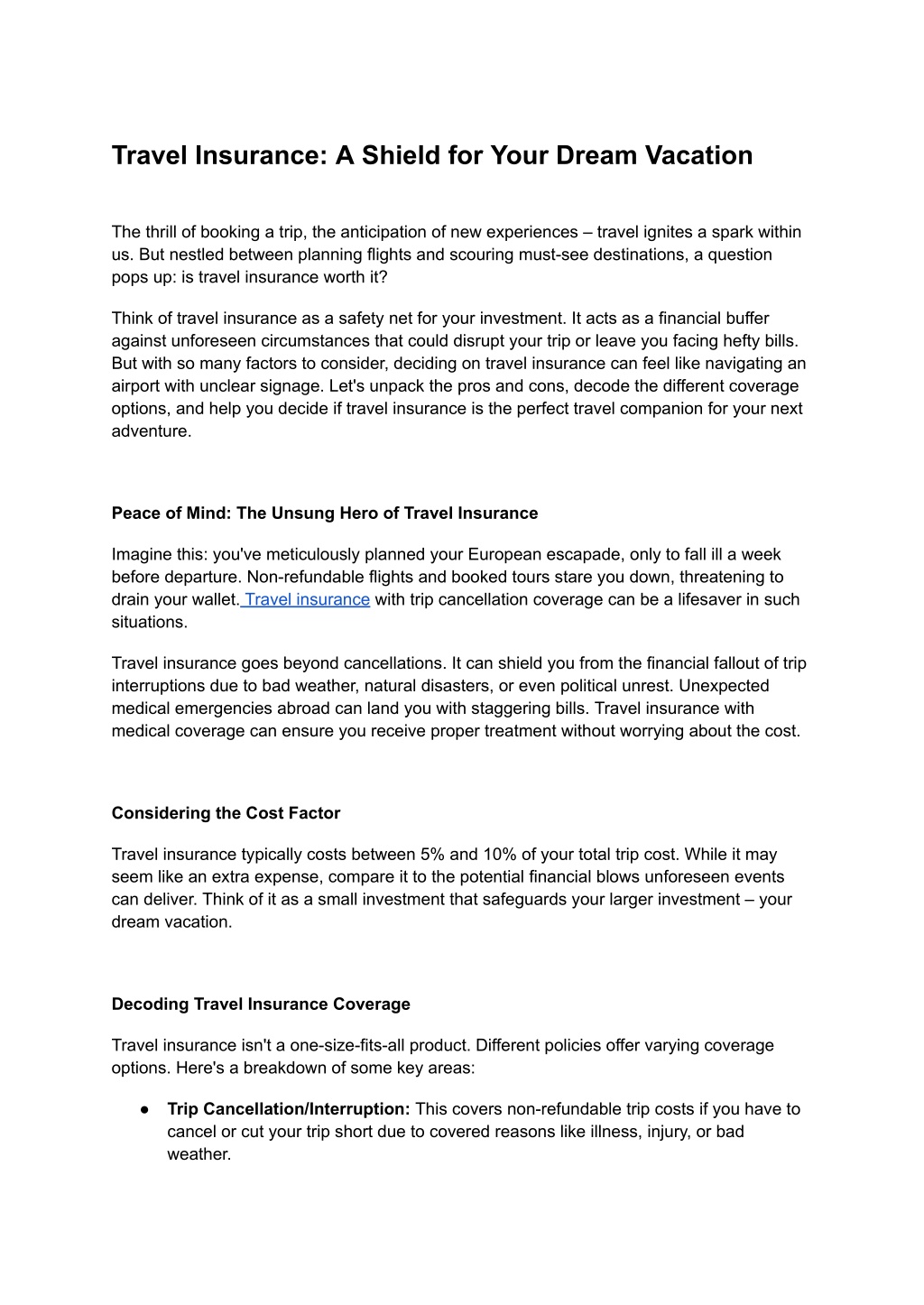 Travel Insurance: A Shield for Your Dream Vacation The thrill of booking a trip, the anticipation of new experiences travel ignites a spark within us. But nestled between planning flights and scouring must-see destinations, a question pops up: is travel insurance worth it? Think of travel insurance as a safety net for your investment. It acts as a financial buffer against unforeseen circumstances that could disrupt your trip or leave you facing hefty bills. But with so many factors to consider, deciding on travel insurance can feel like navigating an airport with unclear signage. Let's unpack the pros and cons, decode the different coverage options, and help you decide if travel insurance is the perfect travel companion for your next adventure. Peace of Mind: The Unsung Hero of Travel Insurance Imagine this: you've meticulously planned your European escapade, only to fall ill a week before departure. Non-refundable flights and booked tours stare you down, threatening to drain your wallet. Travel insurance with trip cancellation coverage can be a lifesaver in such situations. Travel insurance goes beyond cancellations. It can shield you from the financial fallout of trip interruptions due to bad weather, natural disasters, or even political unrest. Unexpected medical emergencies abroad can land you with staggering bills. Travel insurance with medical coverage can ensure you receive proper treatment without worrying about the cost. Considering the Cost Factor Travel insurance typically costs between 5% and 10% of your total trip cost. While it may seem like an extra expense, compare it to the potential financial blows unforeseen events can deliver. Think of it as a small investment that safeguards your larger investment your dream vacation. Decoding Travel Insurance Coverage Travel insurance isn't a one-size-fits-all product. Different policies offer varying coverage options. Here's a breakdown of some key areas: Trip Cancellation/Interruption: This covers non-refundable trip costs if you have to cancel or cut your trip short due to covered reasons like illness, injury, or bad weather.