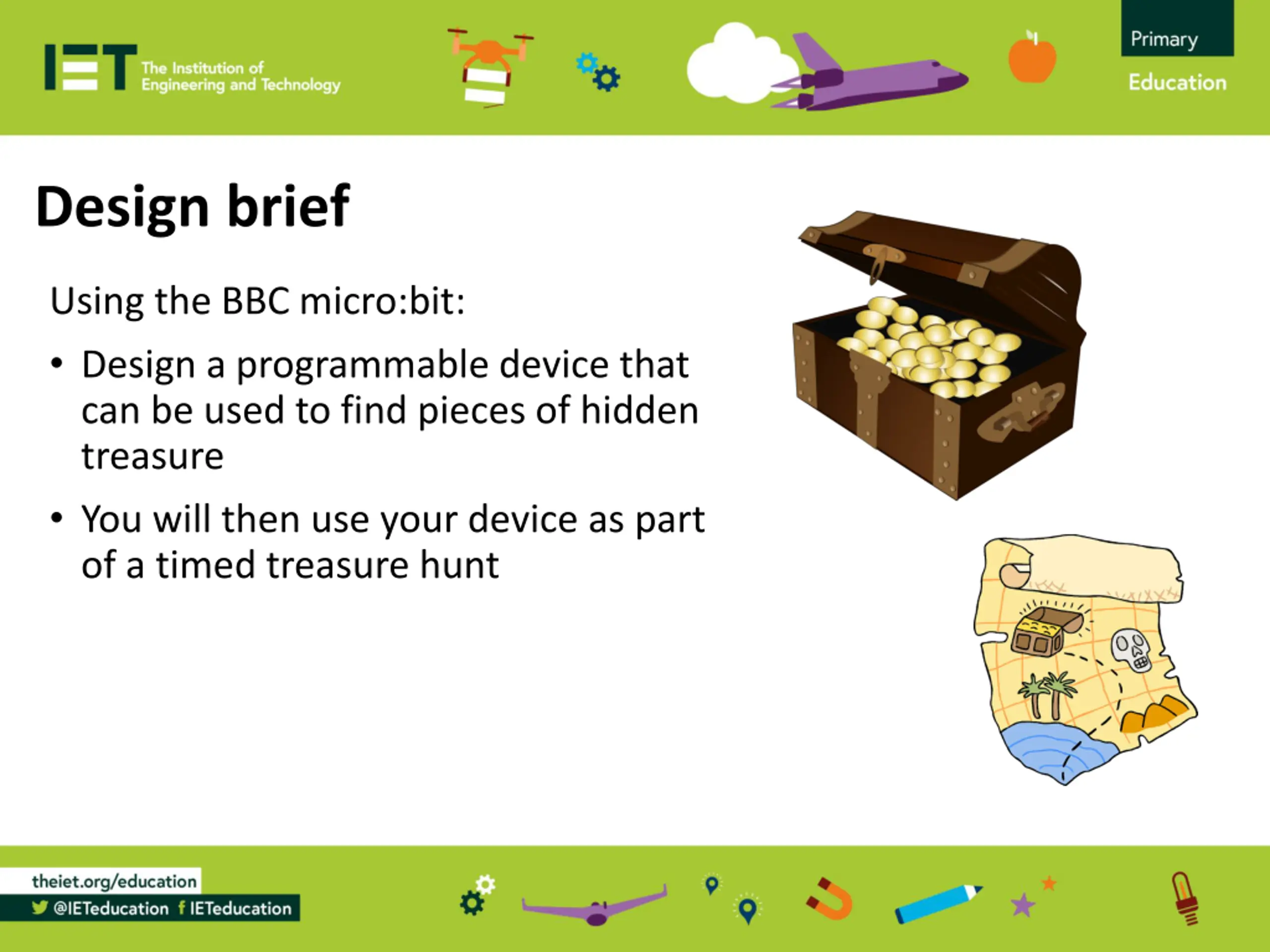 Design brief Using the BBC micro:bit: Design a programmable device that can be used to find pieces of hidden treasure You will then use your device as part of a timed treasure hunt