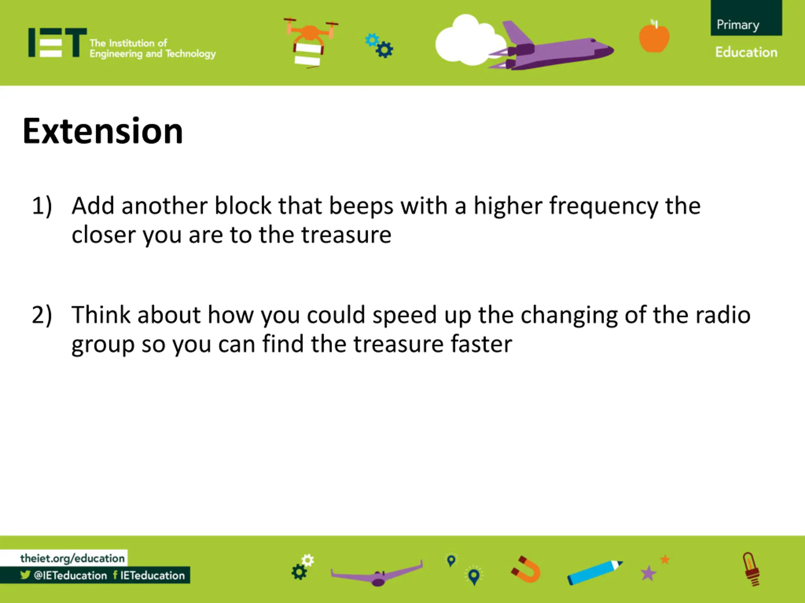 Extension 1) Add another block that beeps with a higher frequency the closer you are to the treasure 2) Think about how you could speed up the changing of the radio group so you can find the treasure faster