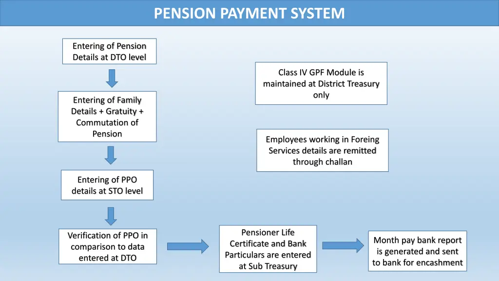 Challan Generation PENSION PAYMENT SYSTEM Entering of Pension Details at DTO level Class IV GPF Module is maintained at District Treasury only Entering of Family Details + Gratuity + Commutation of Pension Employees working in Foreing Services details are remitted through challan Entering of PPO details at STO level Pensioner Life Certificate and Bank Particulars are entered at Sub Treasury Verification of PPO in comparison to data entered at DTO Month pay bank report is generated and sent to bank for encashment