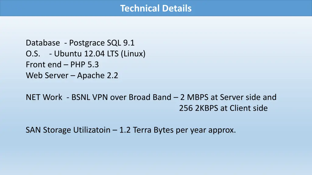 Technical Details Database - Postgrace SQL 9.1 O.S. - Ubuntu 12.04 LTS (Linux) Front end PHP 5.3 Web Server Apache 2.2 NET Work - BSNL VPN over Broad Band 2 MBPS at Server side and 256 2KBPS at Client side SAN Storage Utilizatoin 1.2 Terra Bytes per year approx.