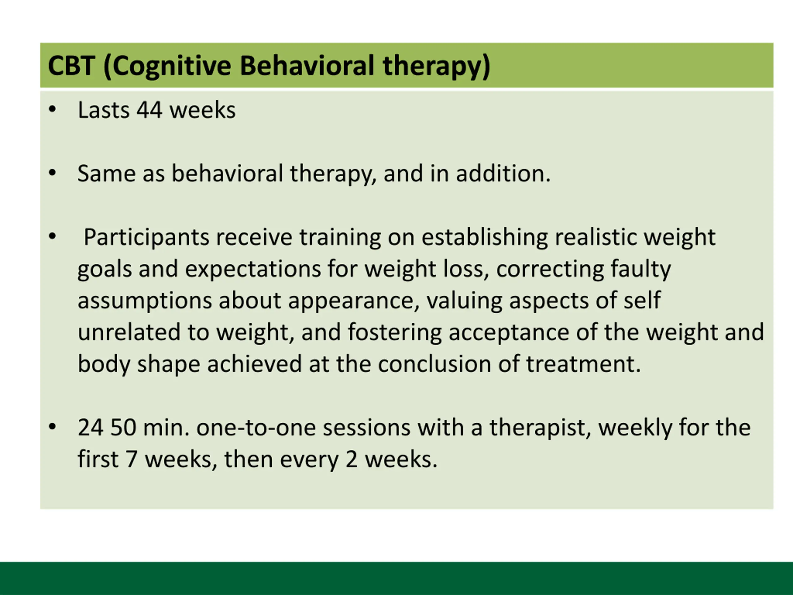 CBT (Cognitive Behavioral therapy) Lasts 44 weeks Same as behavioral therapy, and in addition. Participants receive training on establishing realistic weight goals and expectations for weight loss, correcting faulty assumptions about appearance, valuing aspects of self unrelated to weight, and fostering acceptance of the weight and body shape achieved at the conclusion of treatment. 24 50 min. one-to-one sessions with a therapist, weekly for the first 7 weeks, then every 2 weeks.