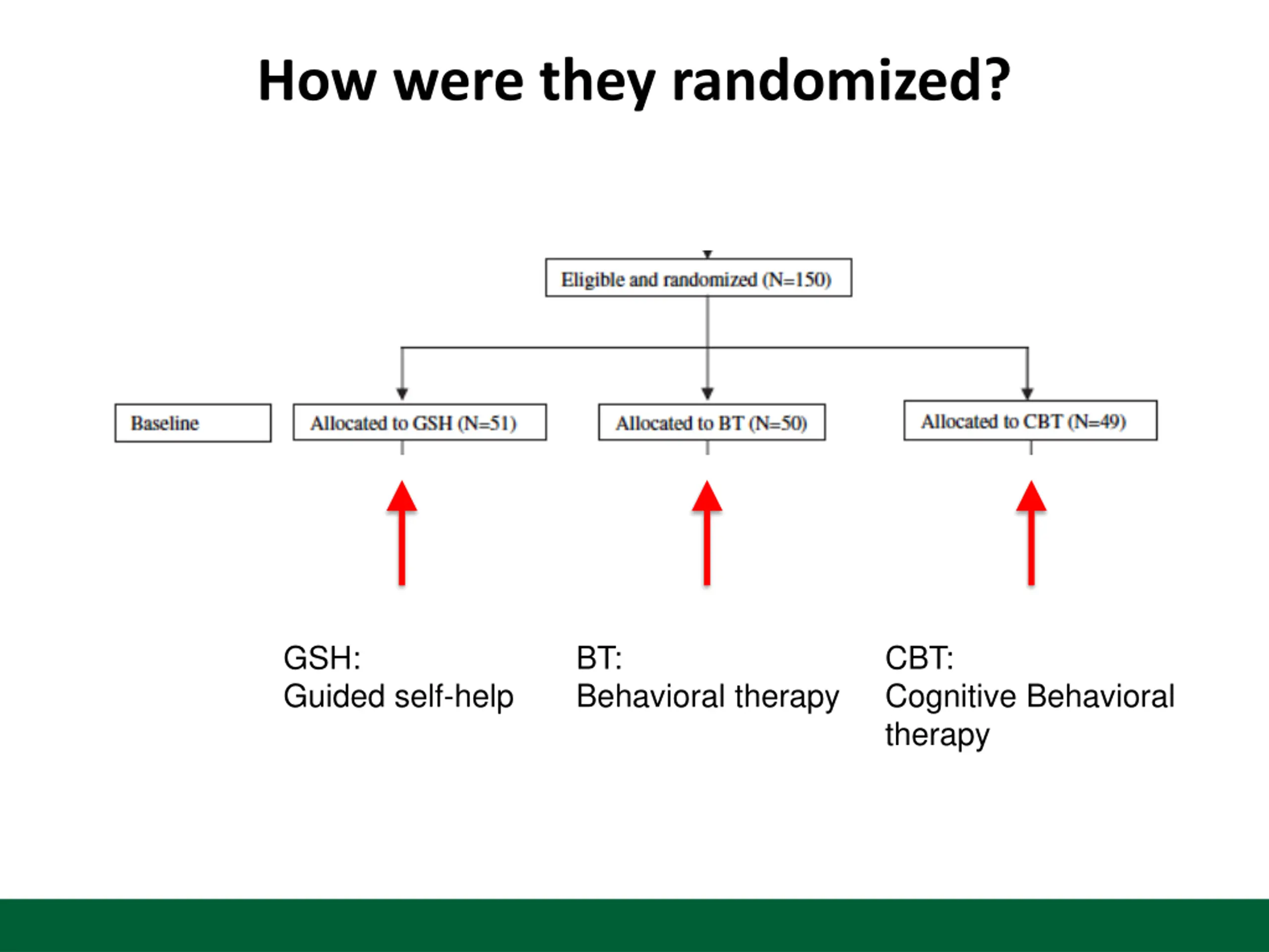 How were they randomized? GSH: Guided self-help BT: Behavioral therapy CBT: Cognitive Behavioral therapy