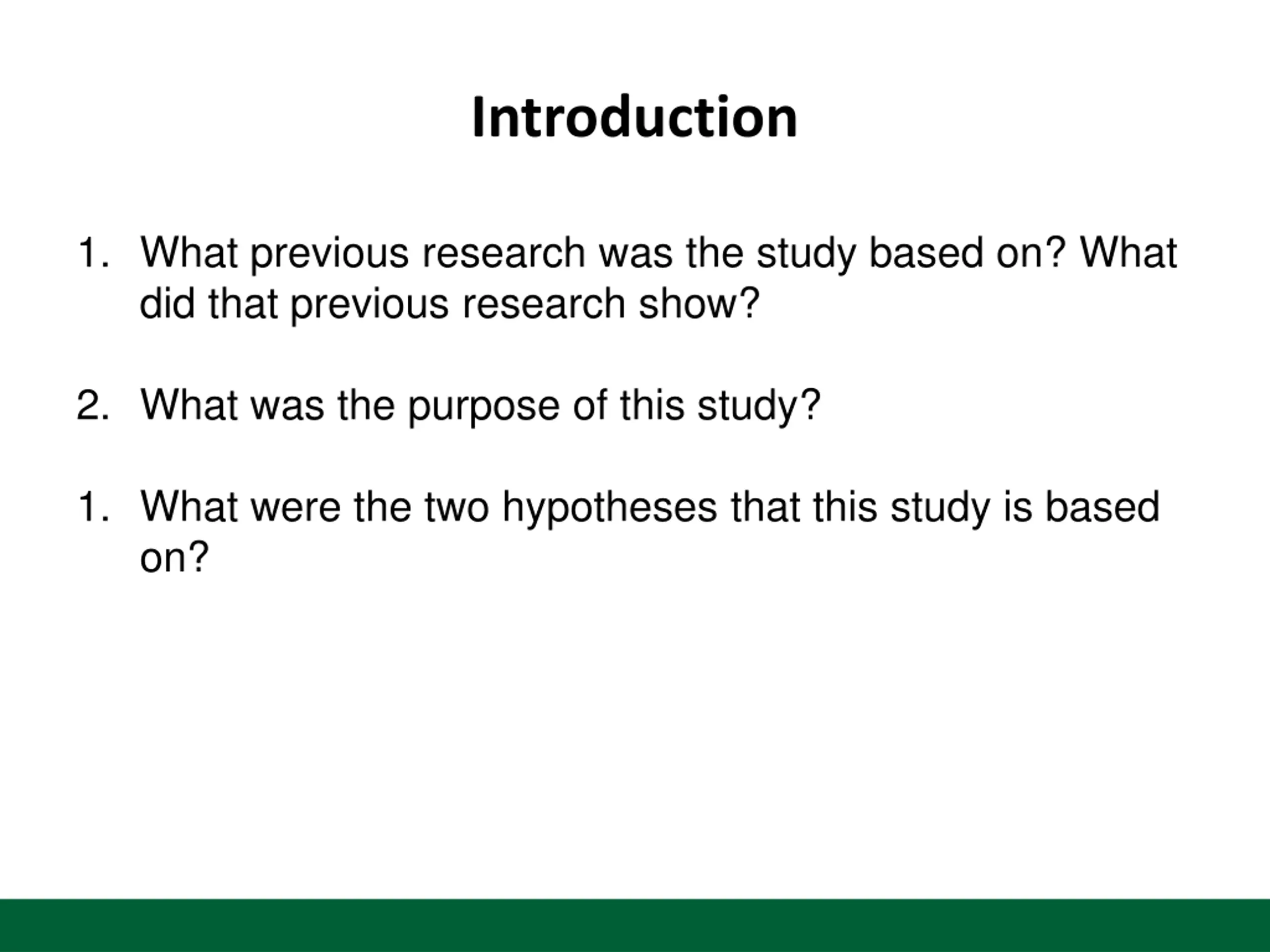 Introduction 1. What previous research was the study based on? What did that previous research show? 2. What was the purpose of this study? 1. What were the two hypotheses that this study is based on?