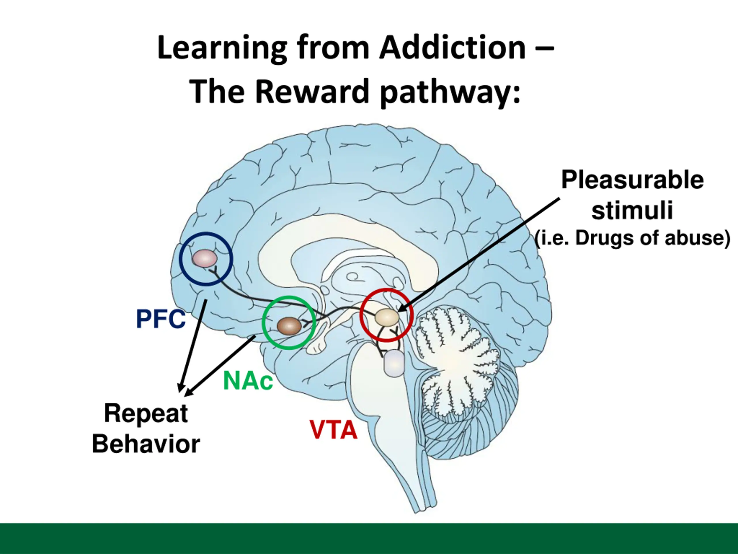 Learning from Addiction The Reward pathway: Pleasurable stimuli (i.e. Drugs of abuse) PFC NAc Repeat Behavior VTA