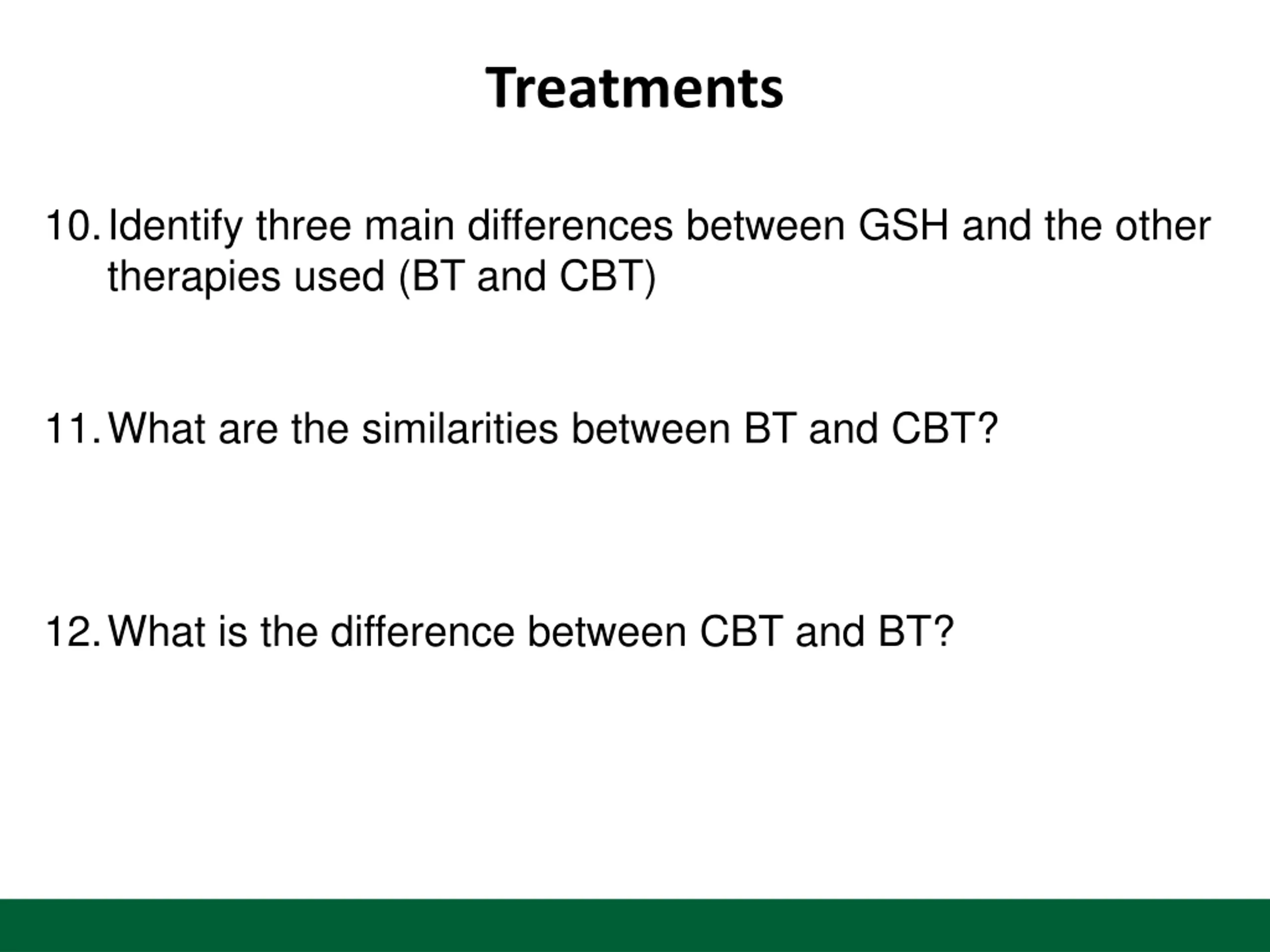 Treatments 10.Identify three main differences between GSH and the other therapies used (BT and CBT) 11.What are the similarities between BT and CBT? 12.What is the difference between CBT and BT?