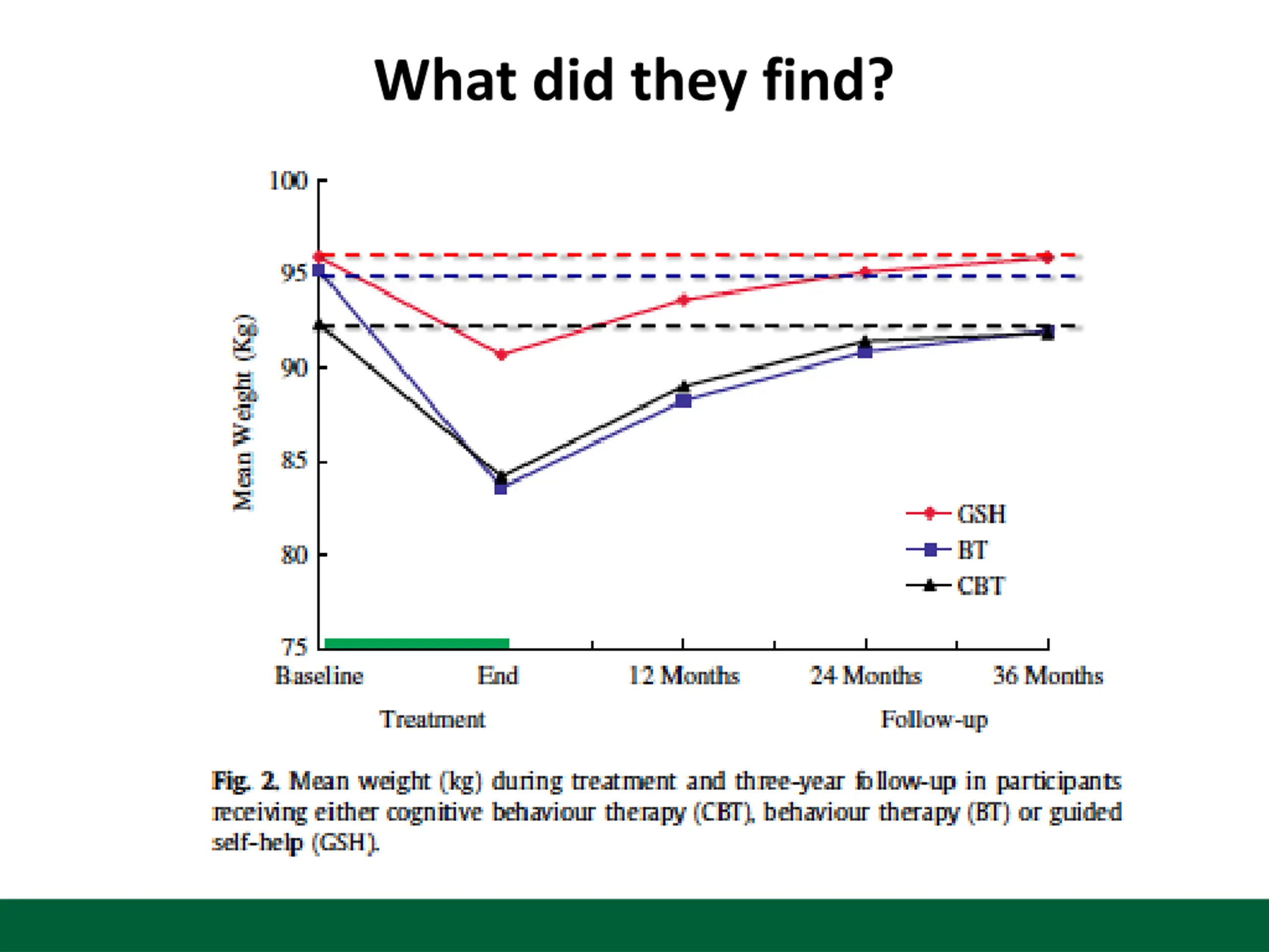 What were the interventions? GSH (Guided self-help) Lasts 24 weeks Participants asked to restrict their calories to 1200 daily, make healthy food choices and gradually increase level of activity 2 face-to-face sessions with a therapist. 15 20-minute phone calls.