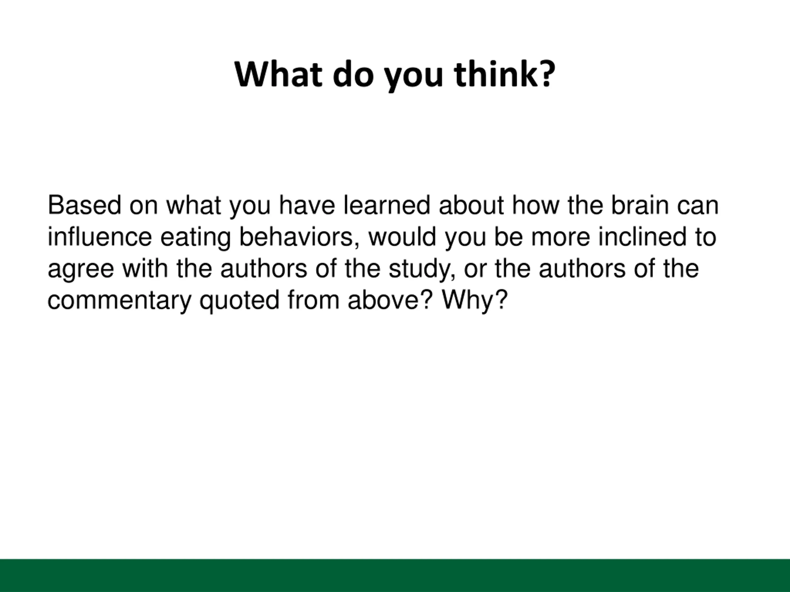 What do you think? Based on what you have learned about how the brain can influence eating behaviors, would you be more inclined to agree with the authors of the study, or the authors of the commentary quoted from above? Why?