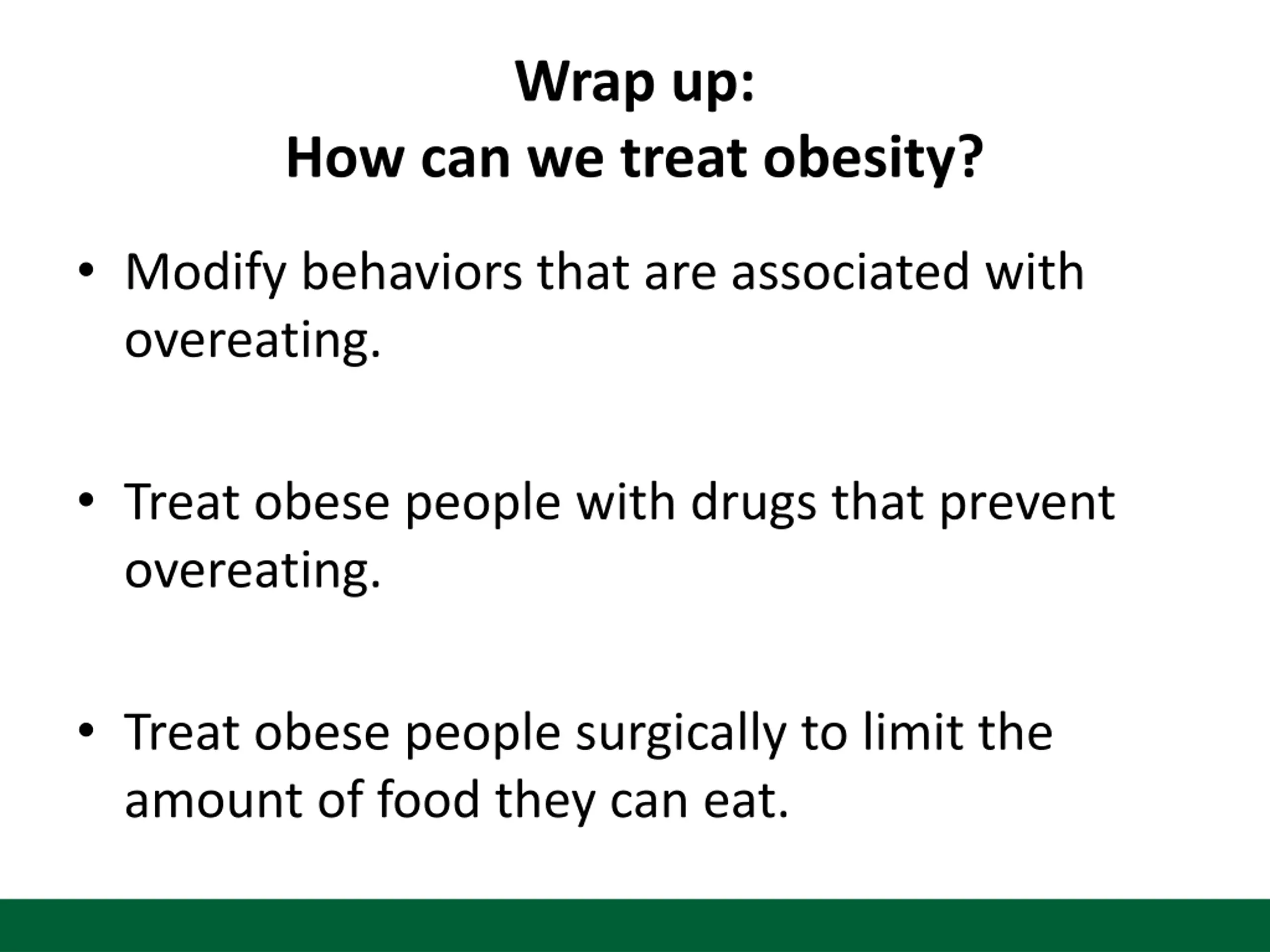 Wrap up: How can we treat obesity? Modify behaviors that are associated with overeating. Treat obese people with drugs that prevent overeating. Treat obese people surgically to limit the amount of food they can eat.