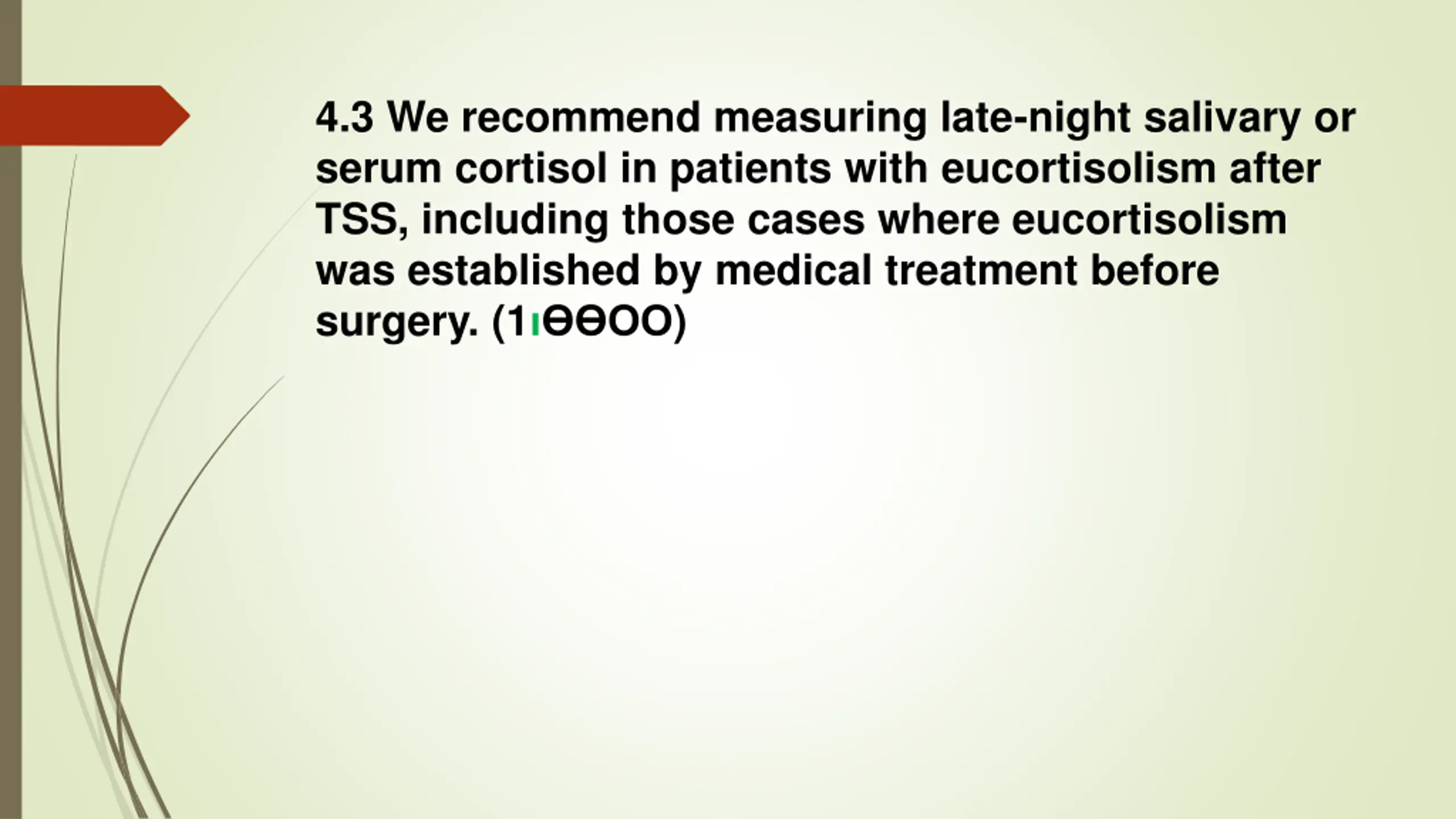 4.3 We recommend measuring late-night salivary or serum cortisol in patients with eucortisolism after TSS, including those cases where eucortisolism was established by medical treatment before surgery. (1 )