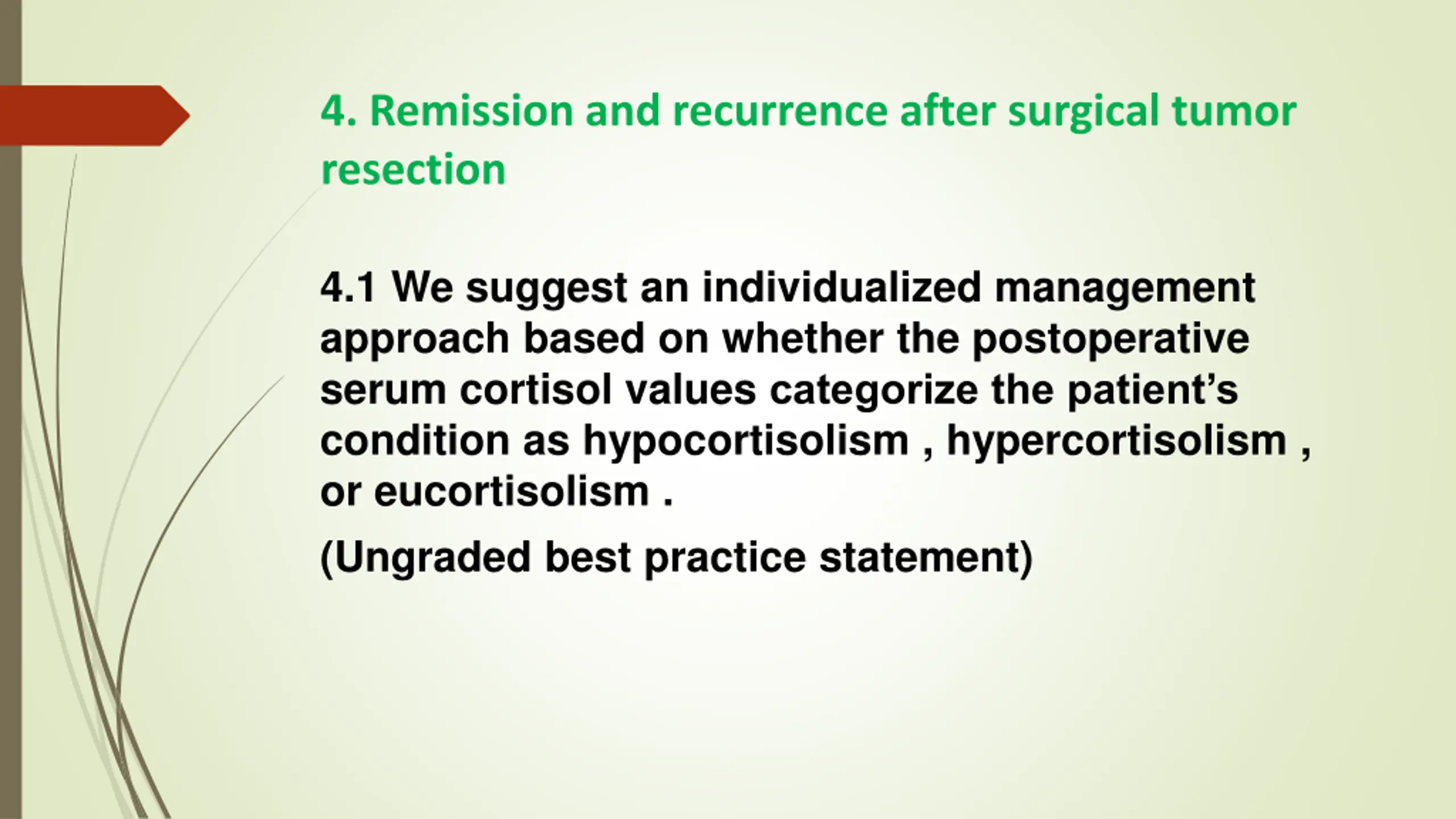 4. Remission and recurrence after surgical tumor resection 4.1 We suggest an individualized management approach based on whether the postoperative serum cortisol values categorize the patient s condition as hypocortisolism , hypercortisolism , or eucortisolism . (Ungraded best practice statement)
