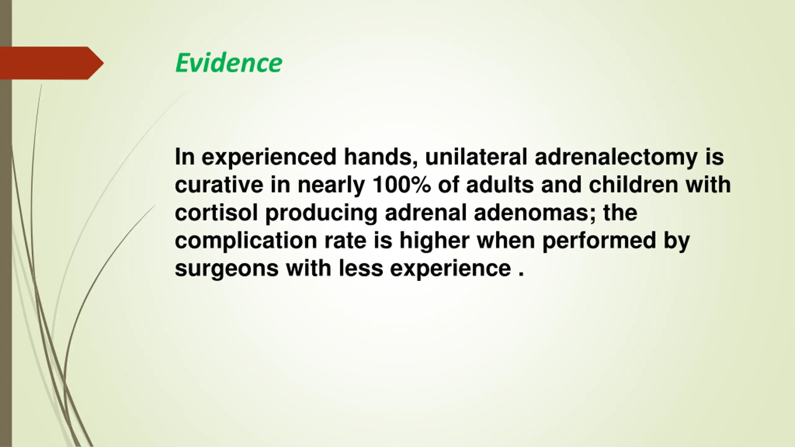 Evidence In experienced hands, unilateral adrenalectomy is curative in nearly 100% of adults and children with cortisol producing adrenal adenomas; the complication rate is higher when performed by surgeons with less experience .