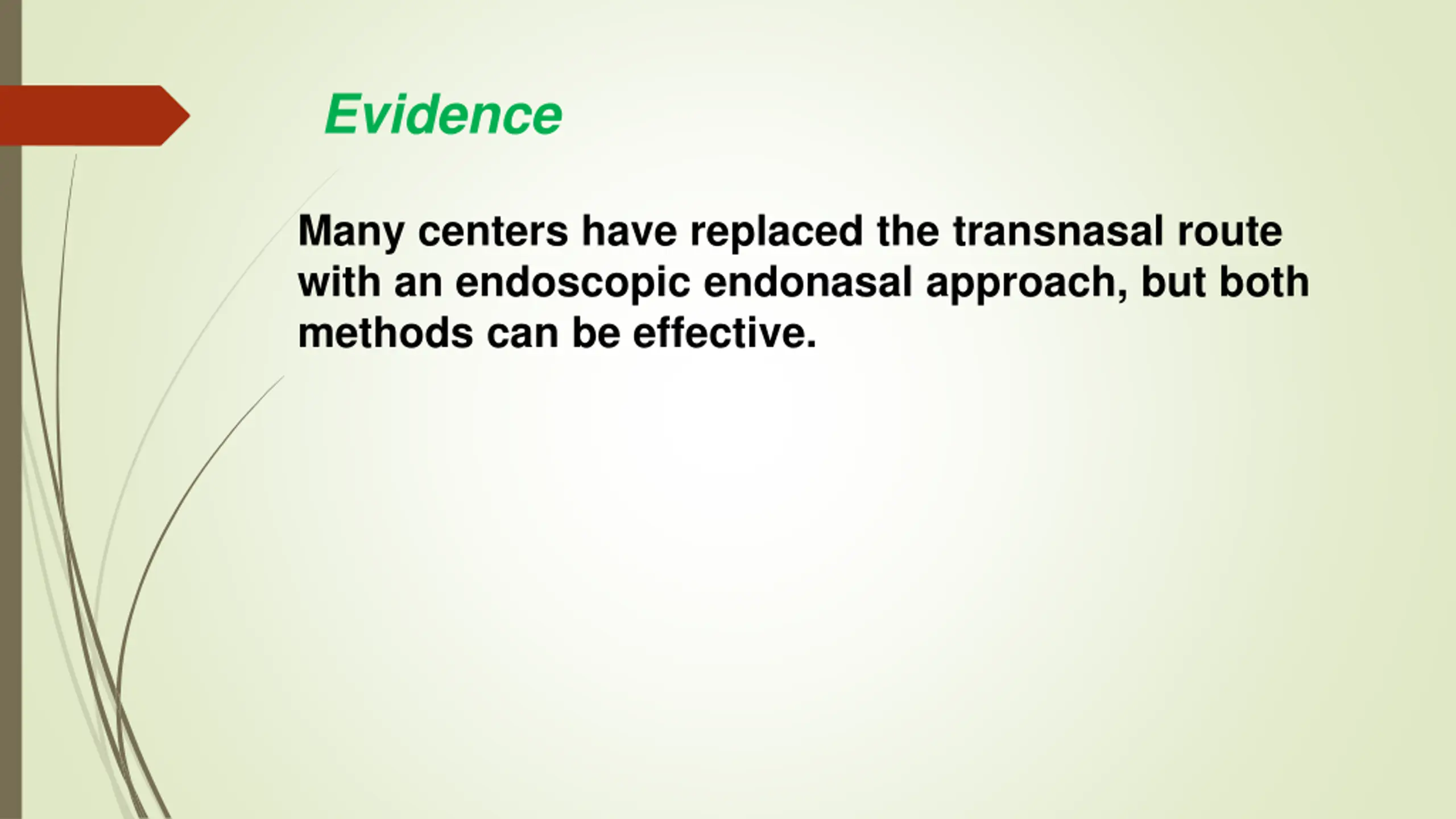 Evidence Many centers have replaced the transnasal route with an endoscopic endonasal approach, but both methods can be effective.