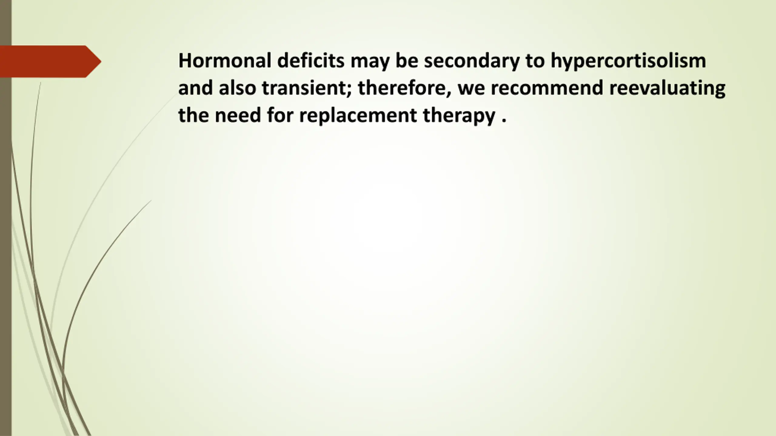 Hormonal deficits may be secondary to hypercortisolism and also transient; therefore, we recommend reevaluating the need for replacement therapy .
