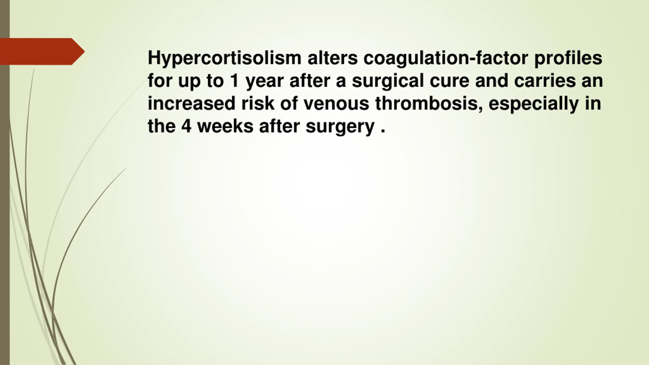 Hypercortisolism alters coagulation-factor profiles for up to 1 year after a surgical cure and carries an increased risk of venous thrombosis, especially in the 4 weeks after surgery .