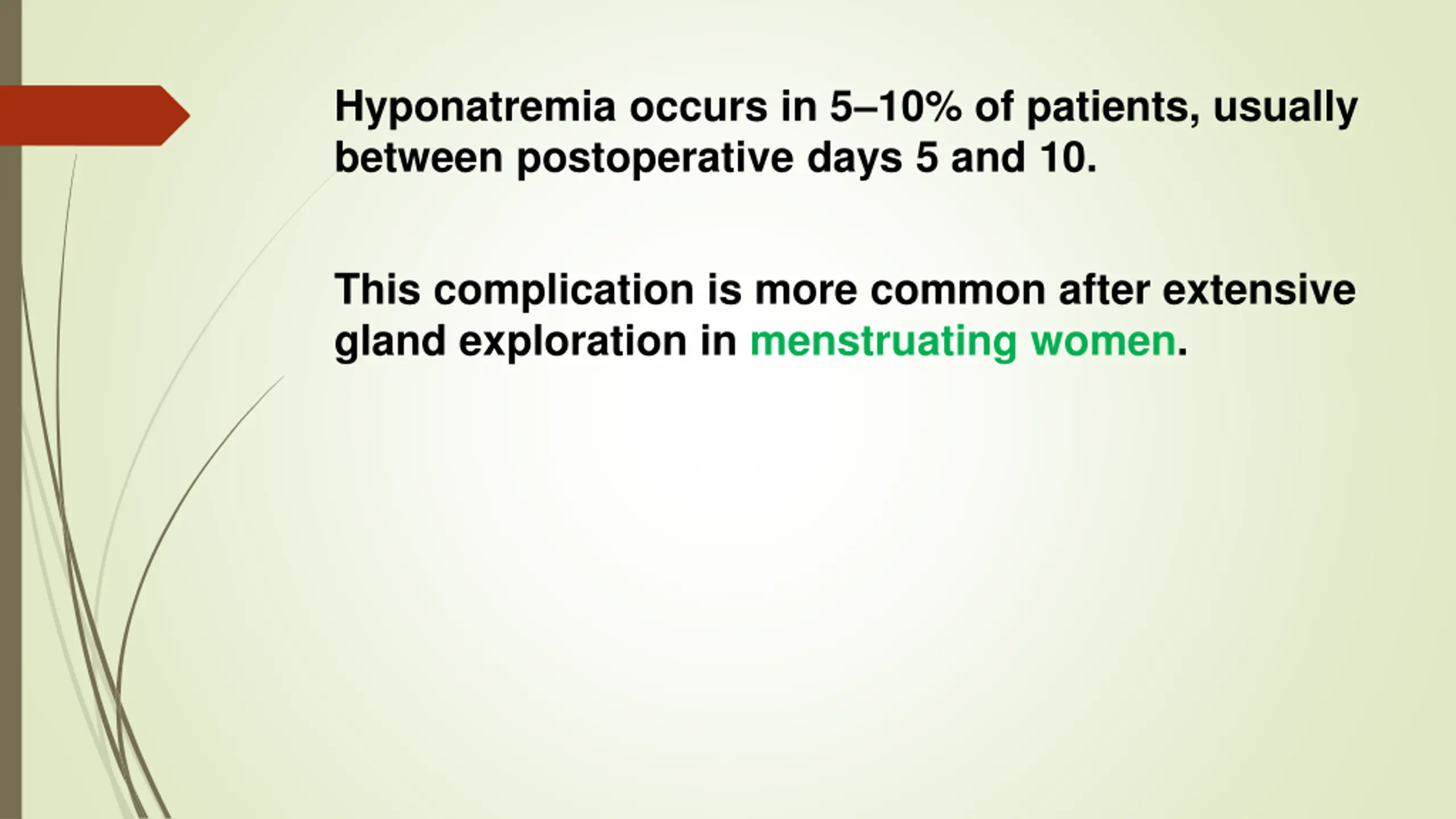 Hyponatremia occurs in 510% of patients, usually between postoperative days 5 and 10. This complication is more common after extensive gland exploration in menstruating women.