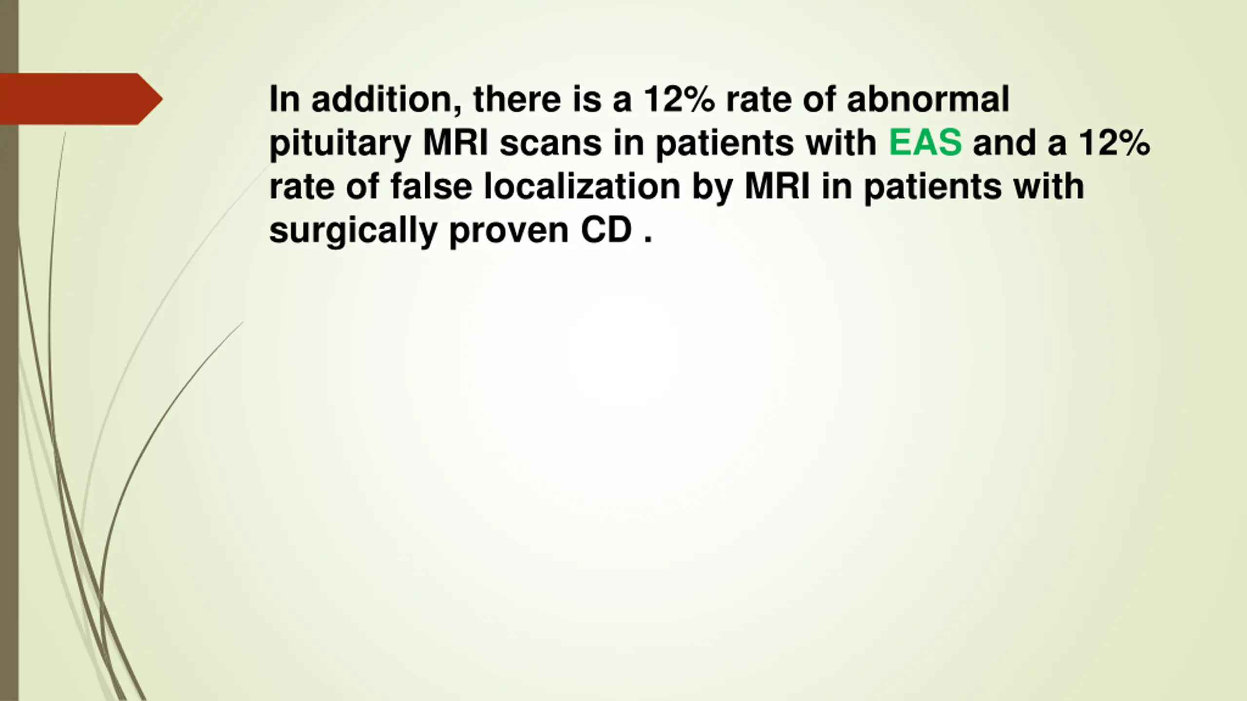 In addition, there is a 12% rate of abnormal pituitary MRI scans in patients with EAS and a 12% rate of false localization by MRI in patients with surgically proven CD .