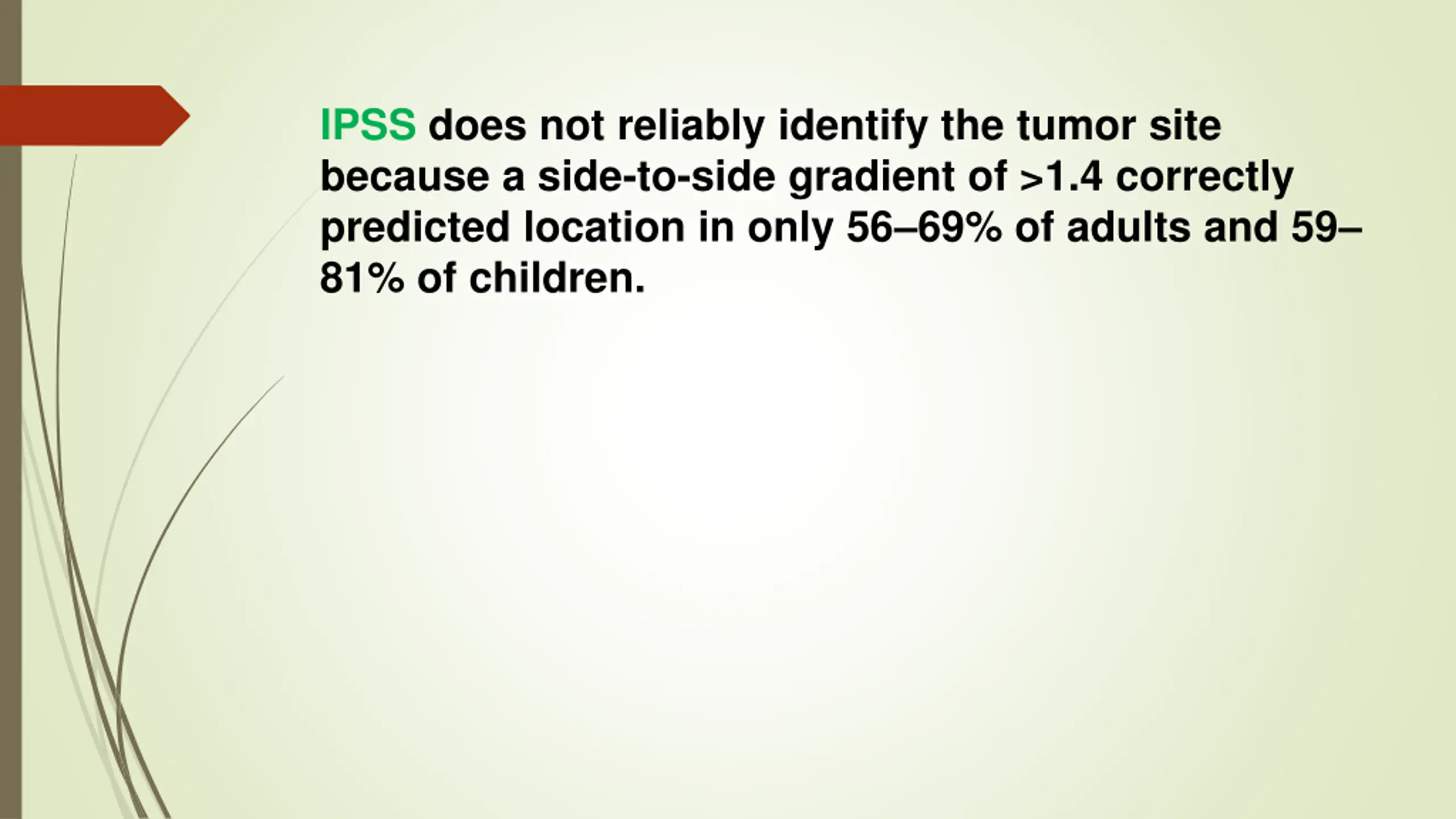 IPSS does not reliably identify the tumor site because a side-to-side gradient of >1.4 correctly predicted location in only 56 69% of adults and 59 81% of children.