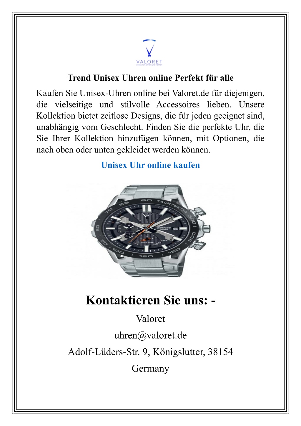 Trend Unisex Uhren online Perfekt fr alle Kaufen Sie Unisex-Uhren online bei Valoret.de f r diejenigen, die vielseitige und stilvolle Accessoires lieben. Unsere Kollektion bietet zeitlose Designs, die f r jeden geeignet sind, unabh ngig vom Geschlecht. Finden Sie die perfekte Uhr, die Sie Ihrer Kollektion hinzuf gen k nnen, mit Optionen, die nach oben oder unten gekleidet werden k nnen. Unisex Uhr online kaufen Kontaktieren Sie uns: - Valoret uhren@valoret.de Adolf-L ders-Str. 9, K nigslutter, 38154 Germany