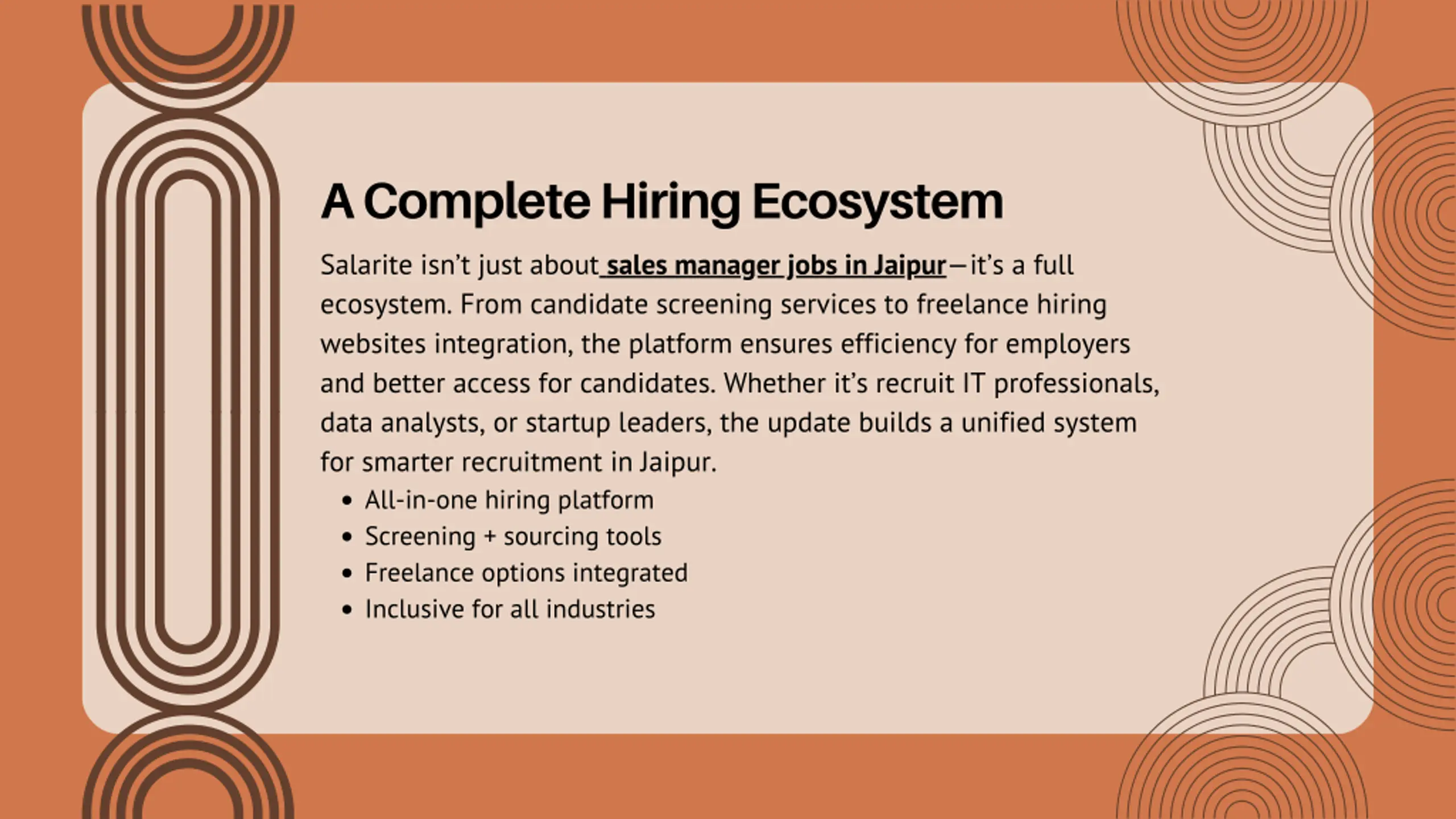 A Complete Hiring Ecosystem Salarite isn t just about sales manager jobs in Jaipur it s a full ecosystem. From candidate screening services to freelance hiring websites integration, the platform ensures efficiency for employers and better access for candidates. Whether it s recruit IT professionals, data analysts, or startup leaders, the update builds a unified system for smarter recruitment in Jaipur. All-in-one hiring platform Screening + sourcing tools Freelance options integrated Inclusive for all industries