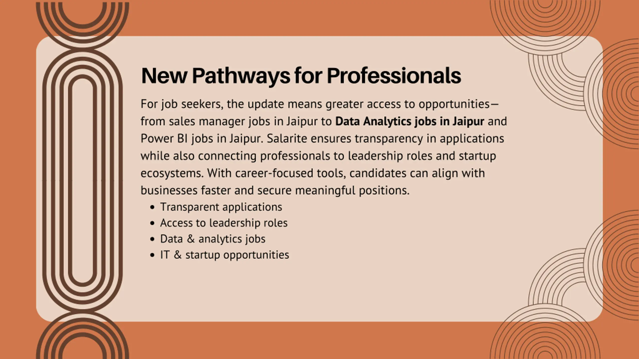 New Pathways for Professionals For job seekers, the update means greater access to opportunities from sales manager jobs in Jaipur to Data Analytics jobs in Jaipur and Power BI jobs in Jaipur. Salarite ensures transparency in applications while also connecting professionals to leadership roles and startup ecosystems. With career-focused tools, candidates can align with businesses faster and secure meaningful positions. Transparent applications Access to leadership roles Data & analytics jobs IT & startup opportunities