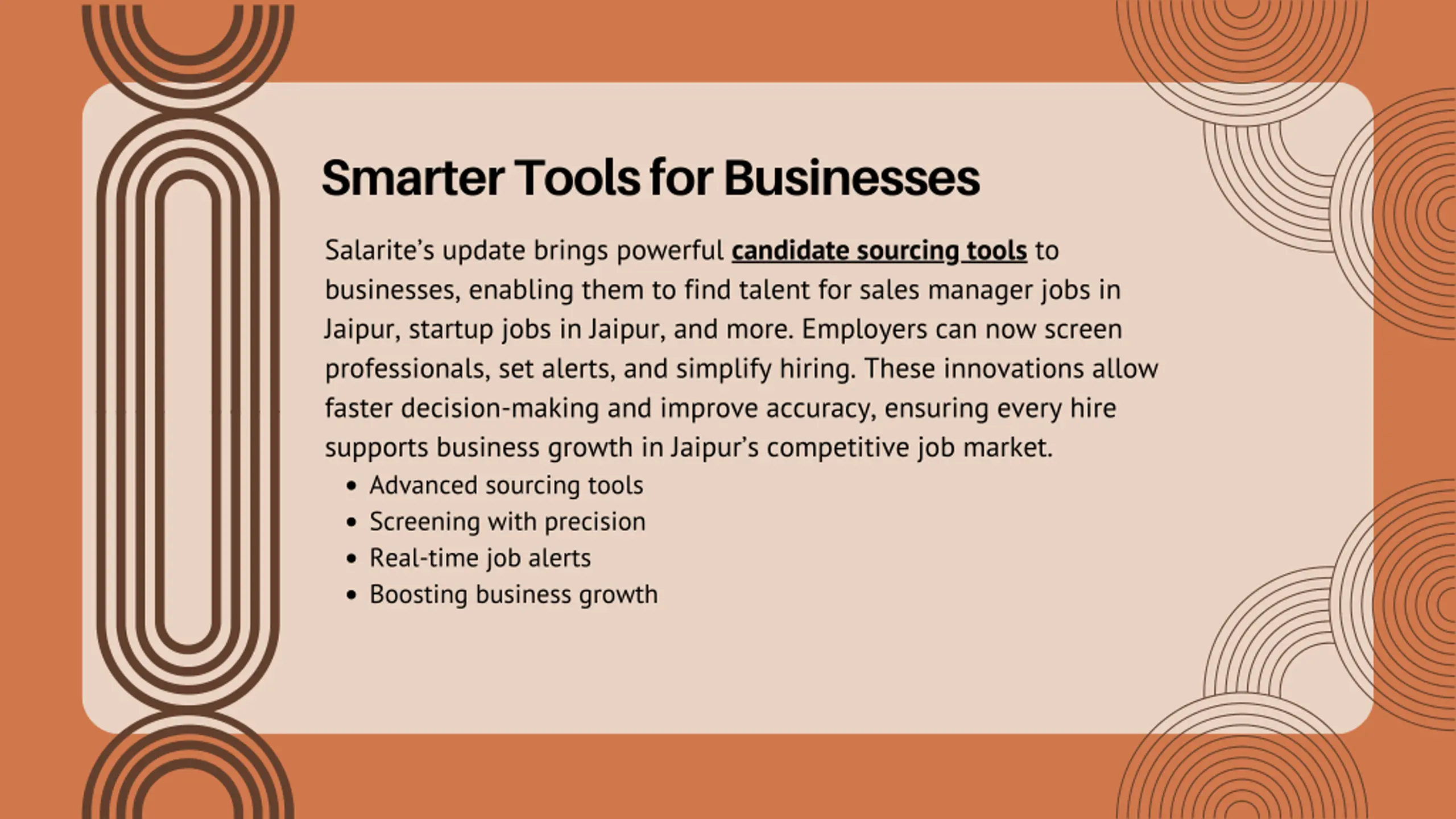 Smarter Tools for Businesses Salarite s update brings powerful candidate sourcing tools to businesses, enabling them to find talent for sales manager jobs in Jaipur, startup jobs in Jaipur, and more. Employers can now screen professionals, set alerts, and simplify hiring. These innovations allow faster decision-making and improve accuracy, ensuring every hire supports business growth in Jaipur s competitive job market. Advanced sourcing tools Screening with precision Real-time job alerts Boosting business growth