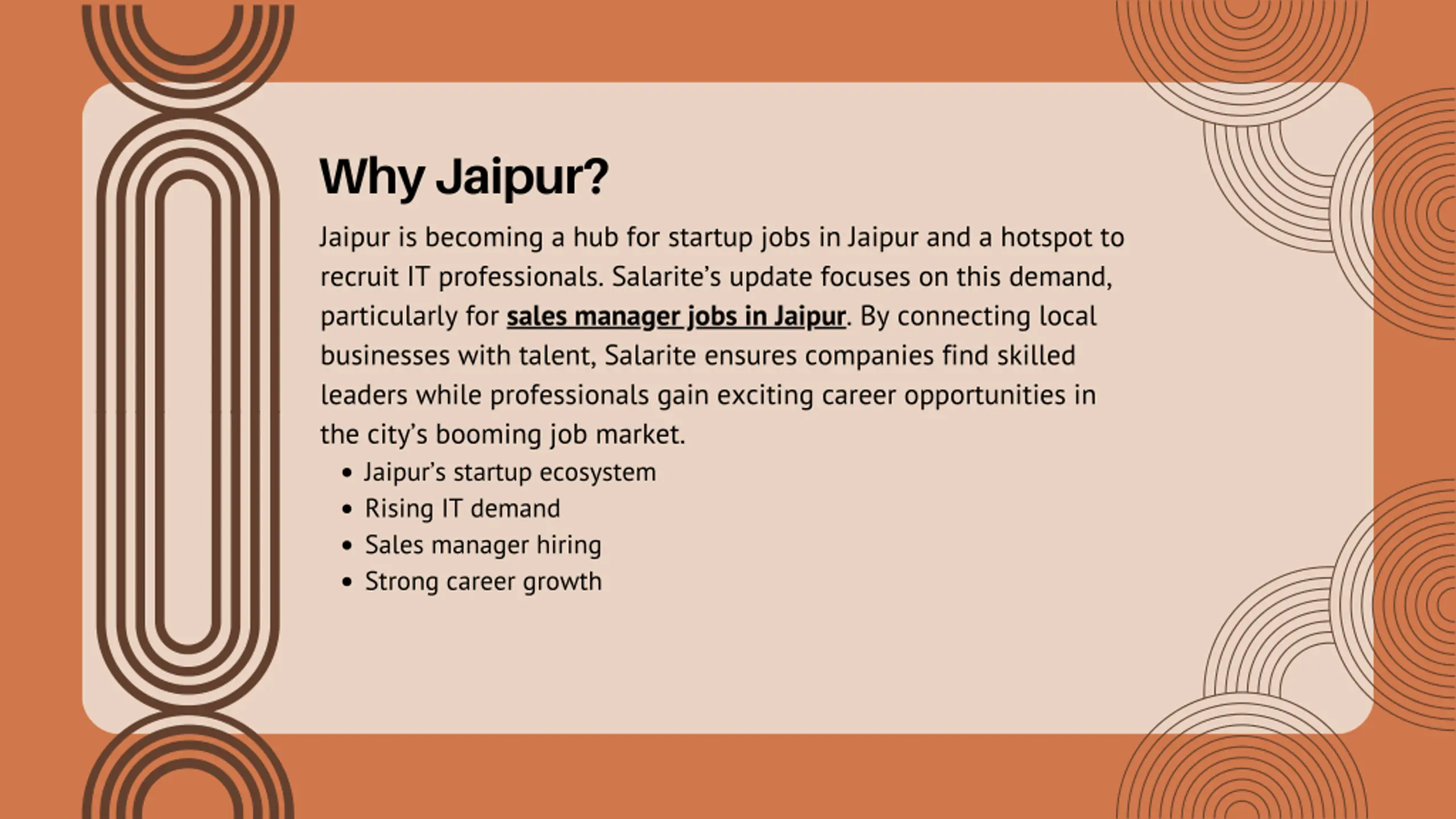 Why Jaipur? Jaipur is becoming a hub for startup jobs in Jaipur and a hotspot to recruit IT professionals. Salarite s update focuses on this demand, particularly for sales manager jobs in Jaipur. By connecting local businesses with talent, Salarite ensures companies find skilled leaders while professionals gain exciting career opportunities in the city s booming job market. Jaipur s startup ecosystem Rising IT demand Sales manager hiring Strong career growth