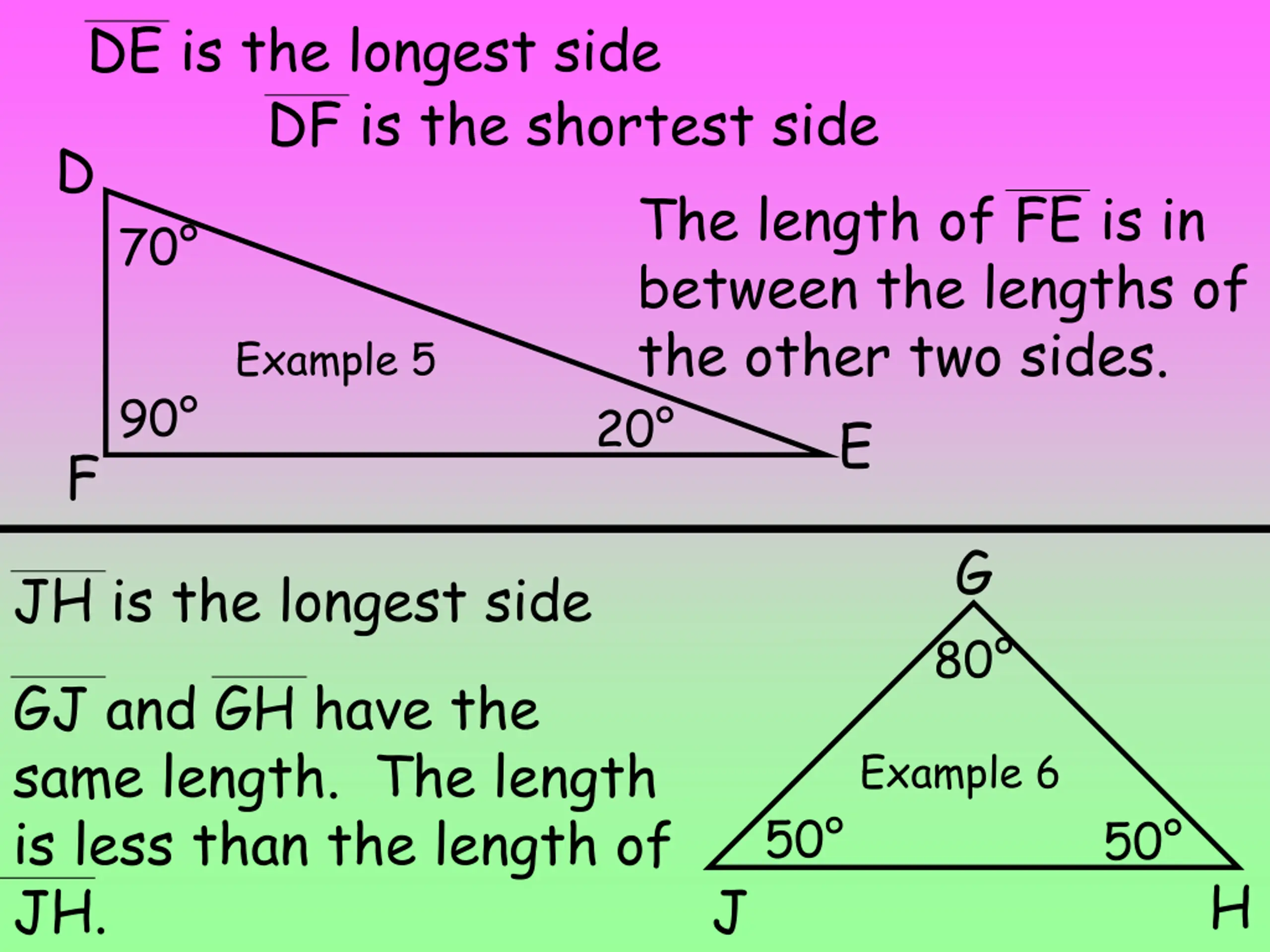 DE is the longest side DF is the shortest side D The length of FE is in between the lengths of the other two sides. 70 Example 5 90 20 E F G JH is the longest side 80 GJ and GH have the same length. The length is less than the length of JH. Example 6 50 50 H J