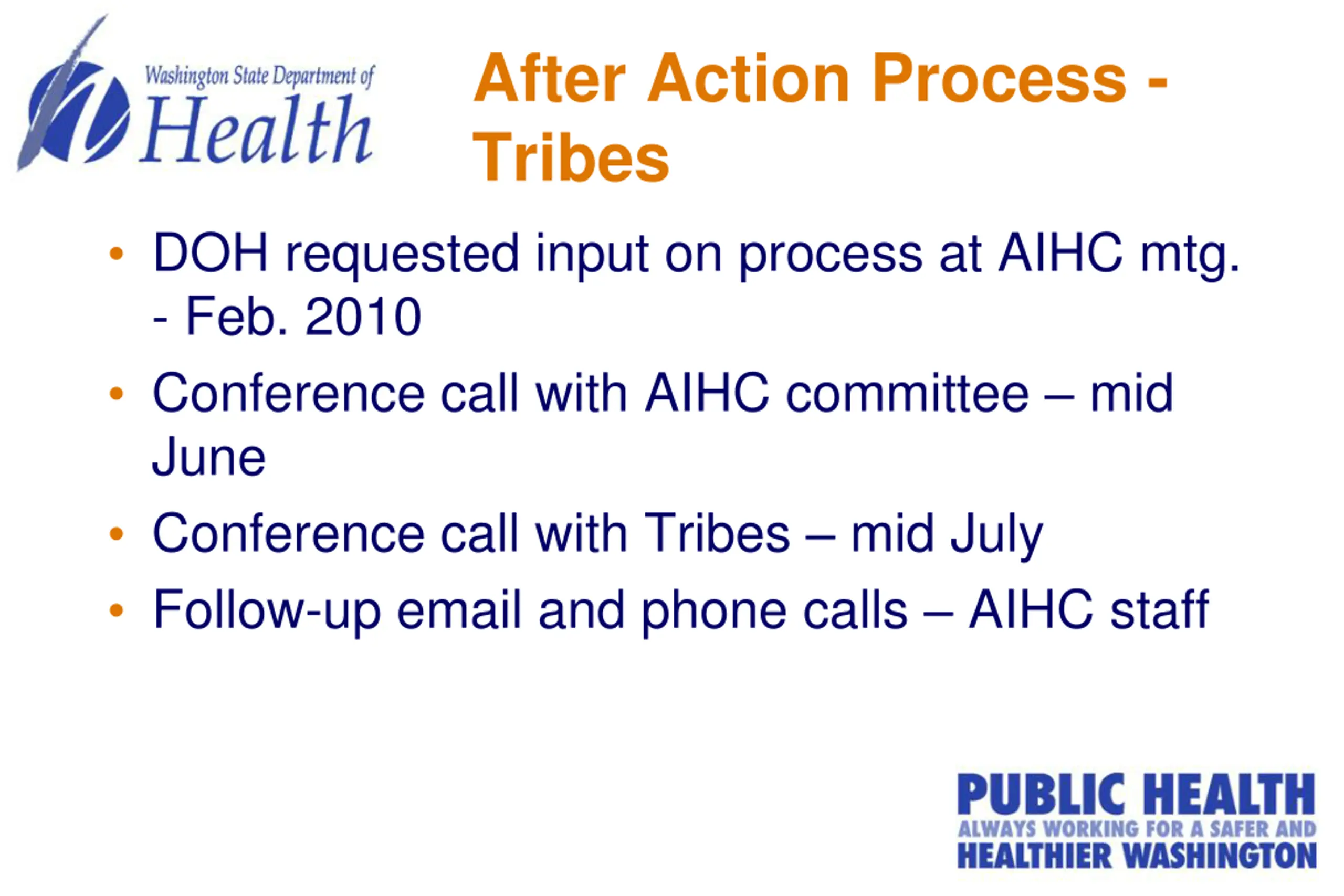 After Action Process - Tribes DOH requested input on process at AIHC mtg. - Feb. 2010 Conference call with AIHC committee mid June Conference call with Tribes mid July Follow-up email and phone calls AIHC staff